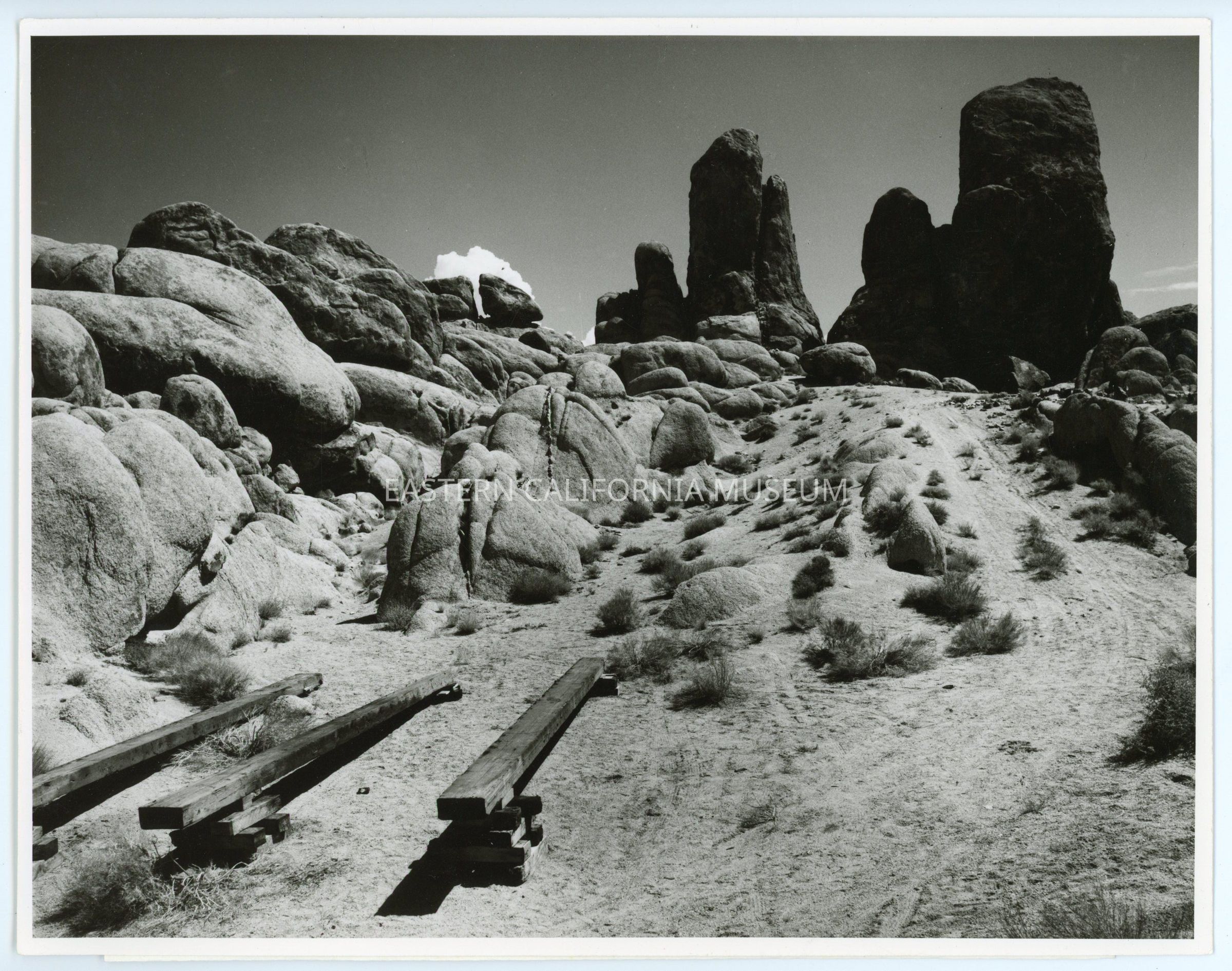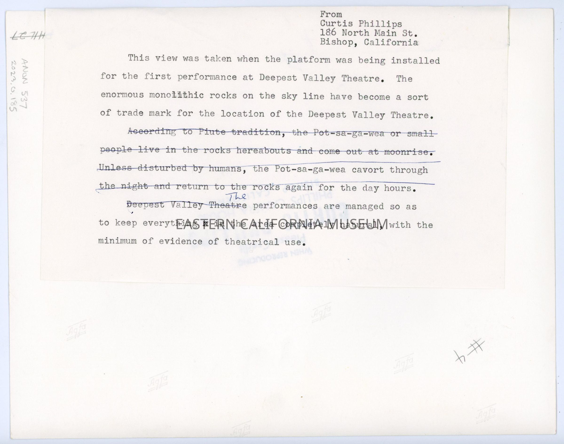 Typewritten caption on a half sheet of paper affixed to reverse: From Curtis Phillips. This view was taken when the platform was being installed for the first performance at Deepest Valley Theatre. The enormous monolithic rocks on the sky line have become a sort of trade mark for the location of the Deepest Valley Theatre. [The following is crossed out: According to Piute tradition, the Pot-sa-ga-wear or small people live in the rocks hereabouts and come out at moonrise. Unless disturbed by humans, the Pot-sa-ga-wea cavort through the night and return to the rocks again for the day hours.] The performances are managed so as to keep everything in the area completely natural, with the minimum of evidence of theatrical use.