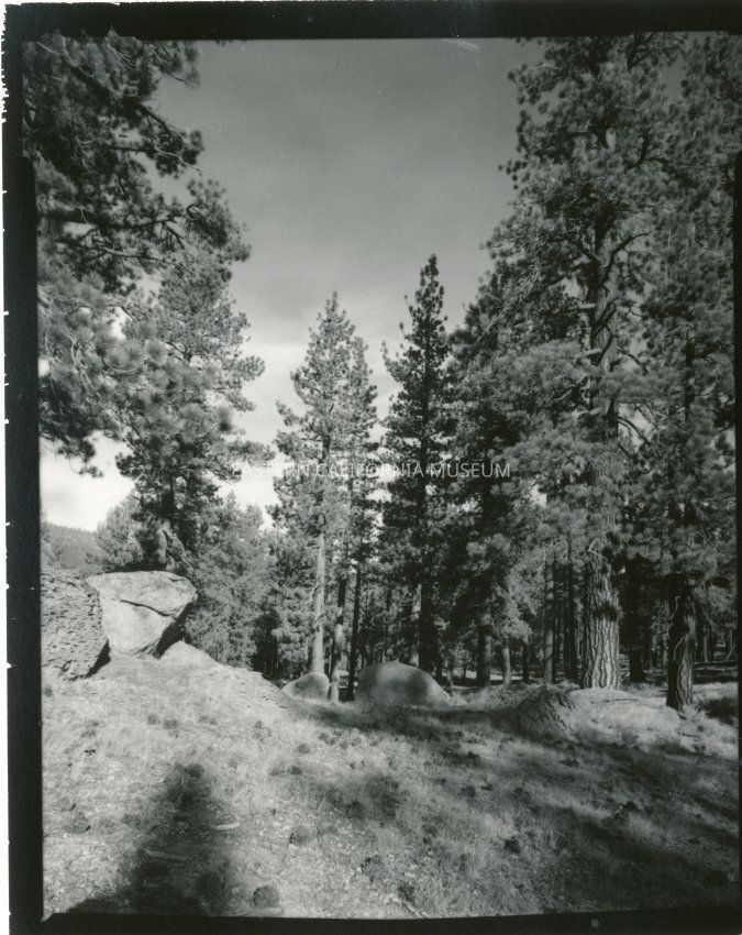 B&W matte print: mounted on heavy card stock; stand of trees, possibly jeffrey pines