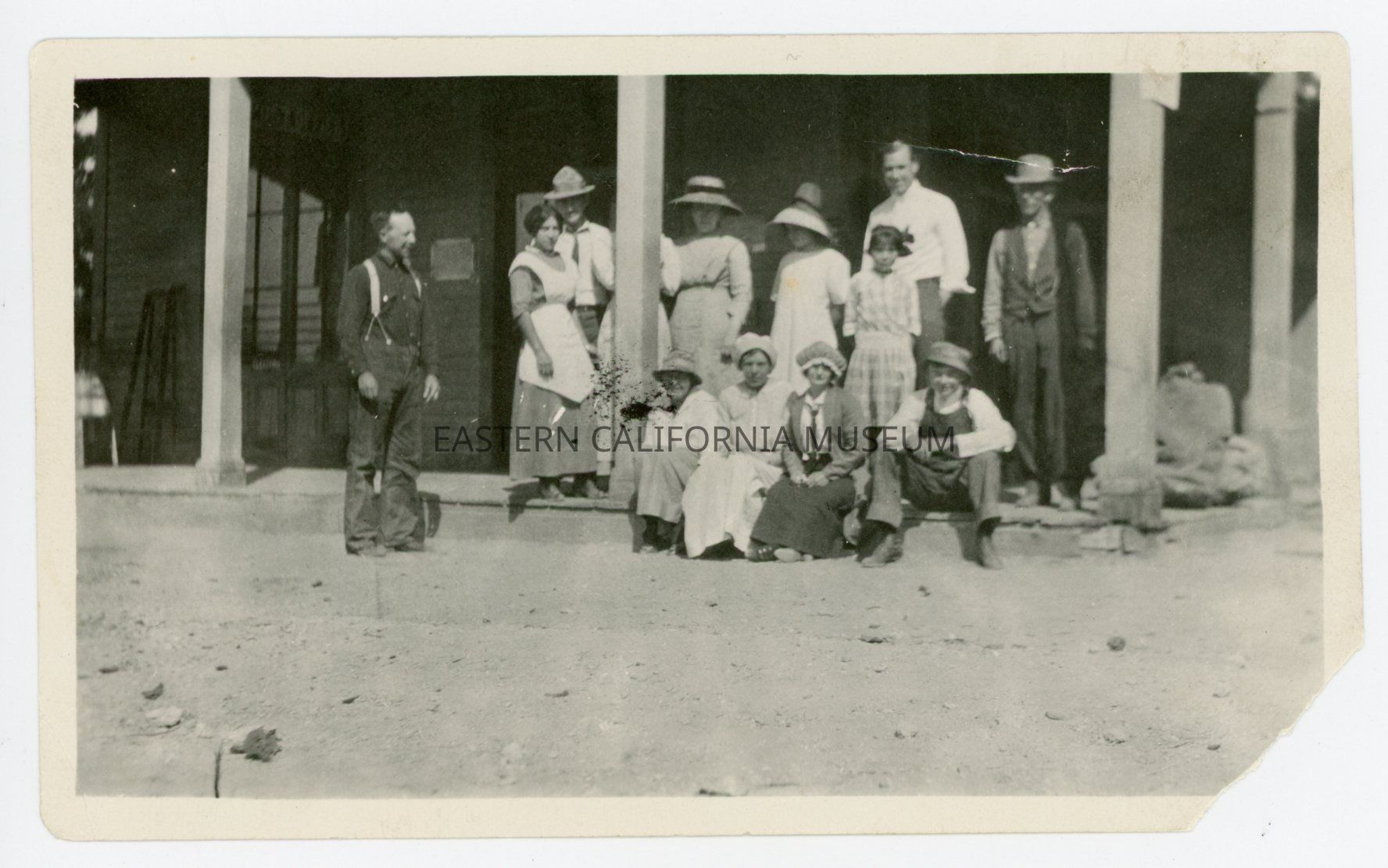Photo of a group of thirteen people standing and sitting on the front porch of a building in Darwin. One person is hiding behind a post.