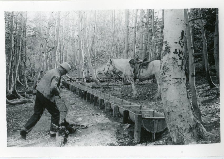 B&W glossy print: man and horse among aspen trees, with long watering trough