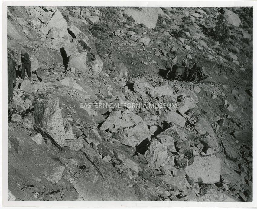 B&W glossy print: very rocky mountainside with early model car/tractor being driven up the road, 2 other men upper left side