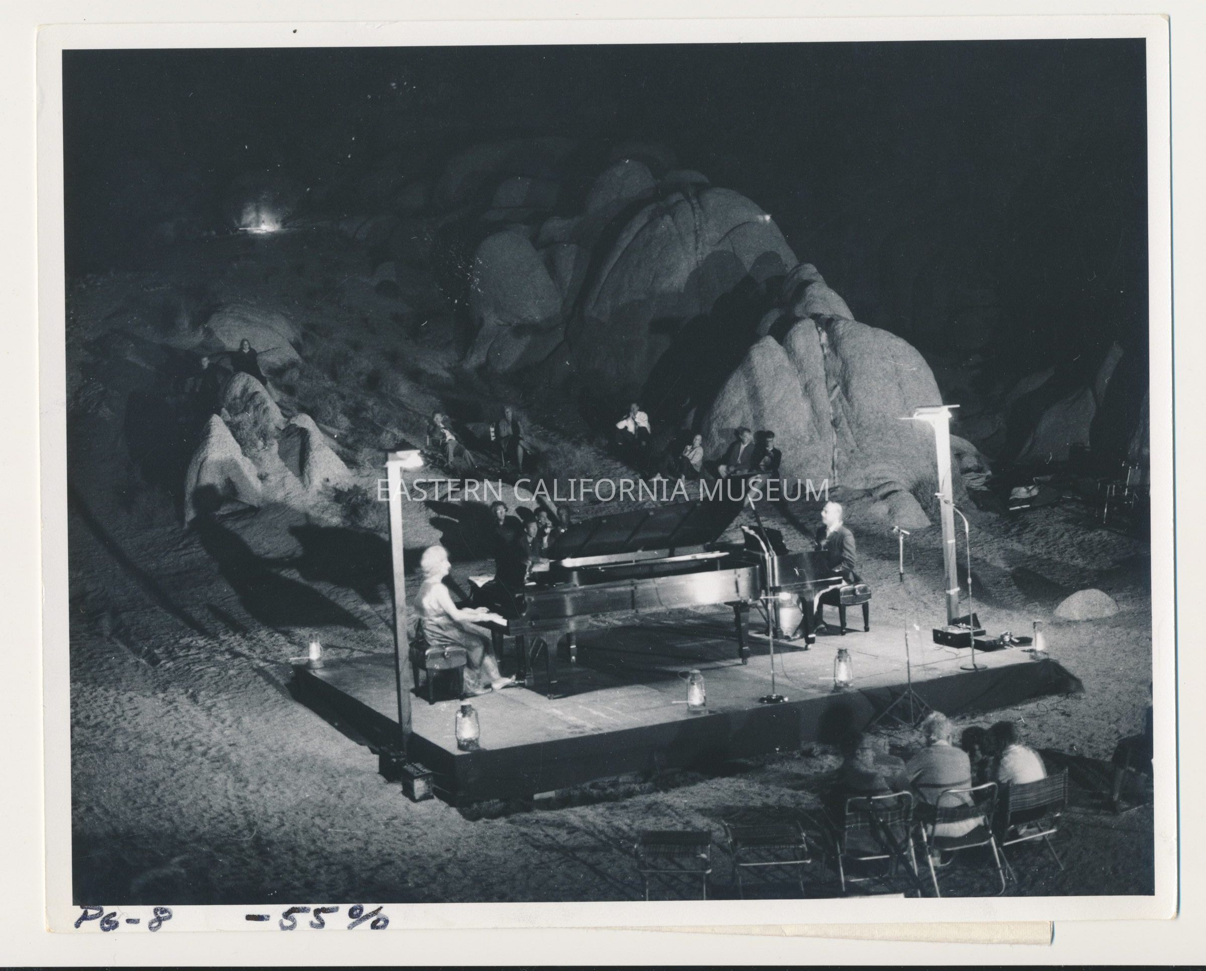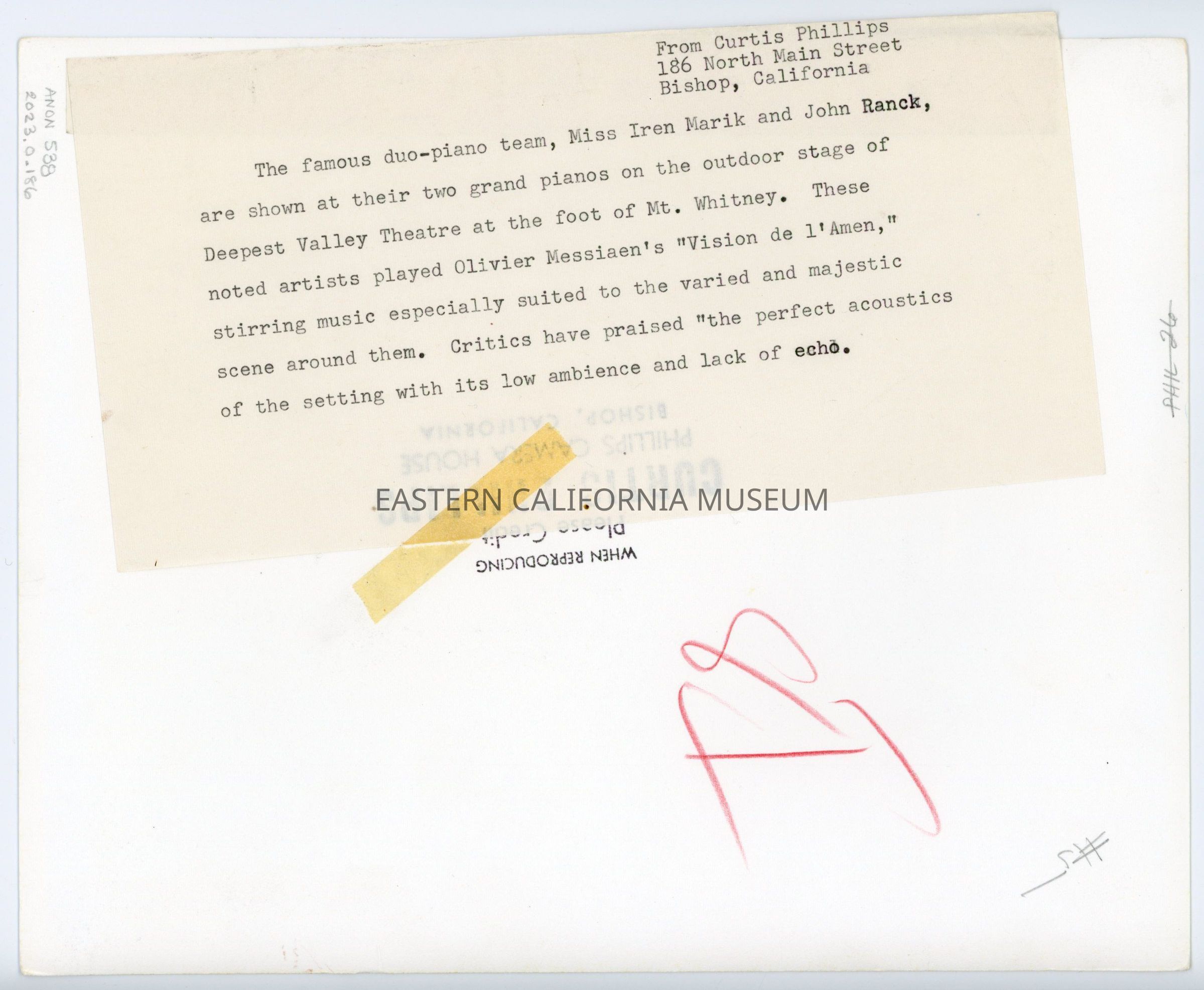 Typewritten caption on a half sheet of paper affixed to reverse: From Curtis Phillips. The famous duo-piano team, Miss Iren Marik and John Ranck, are shown at their two grand pianos on the outdoor stage of Deepest Valley Theatre at the foot of Mt. Whitney. These noted artists played Olivier Messiaen's "Vision de l'Amen," stirring music especially suited to the varied and majestic scene around them. Critics have praised the perfect acoustics of the setting with its low ambience and lack of echo.