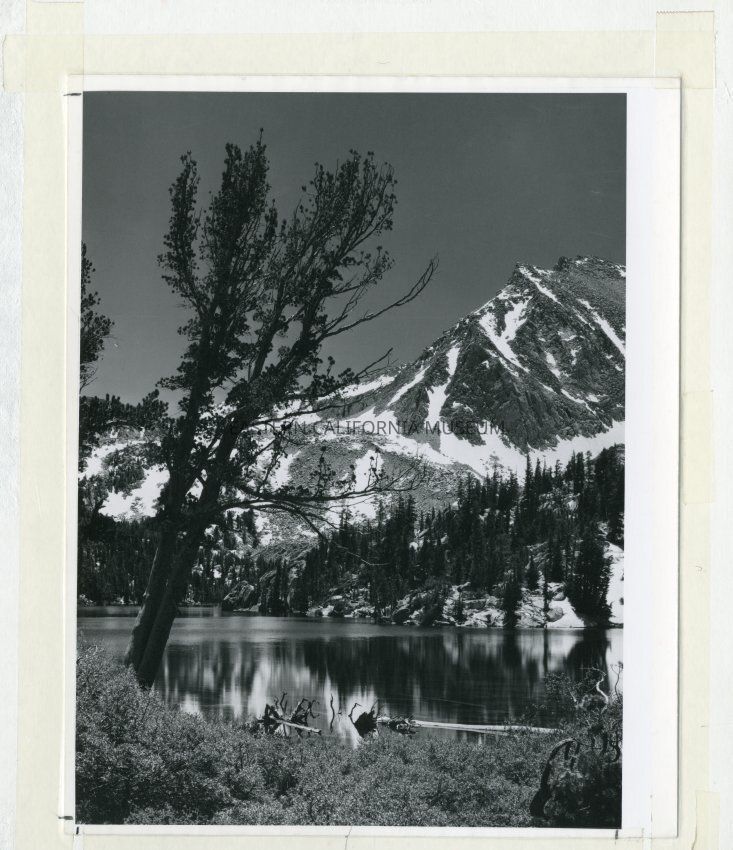 B&W matte print: single tree along side a lake with snow capped mountains in background
