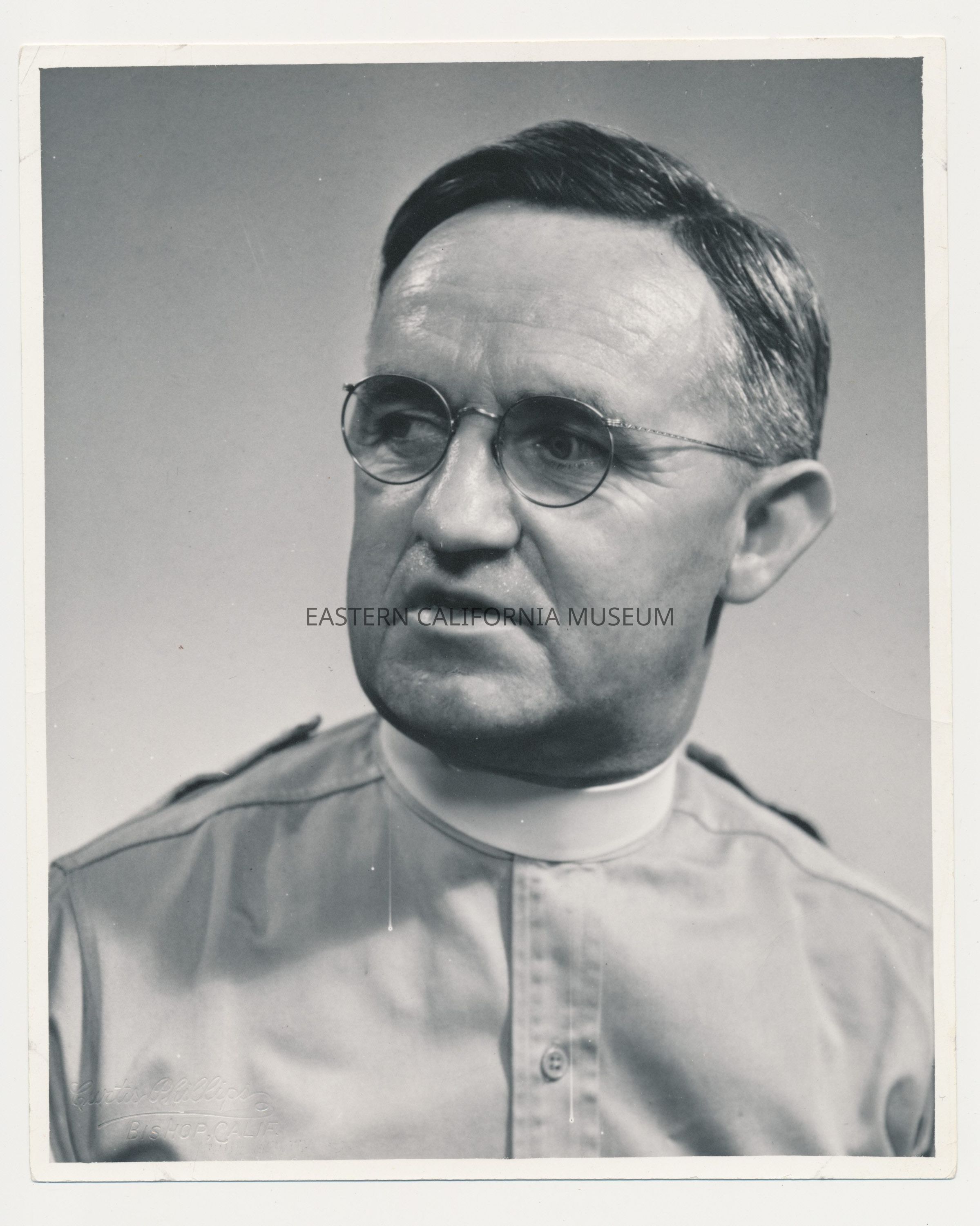 Studio portrait of Father John Crowley taken by Curtis Phillips of Bishop. Photographer's information impressed in lower left corner.