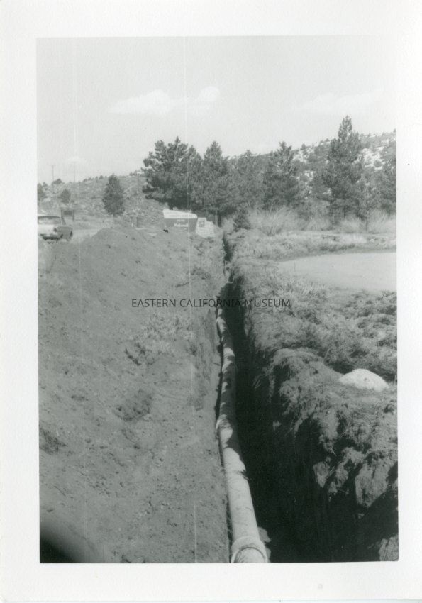 B&W glossy print: ditch with pipe in it, along a road