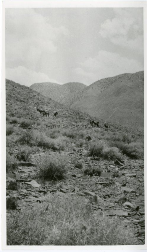B&W glossy print: several horses in backgroun, on sagebrush slope