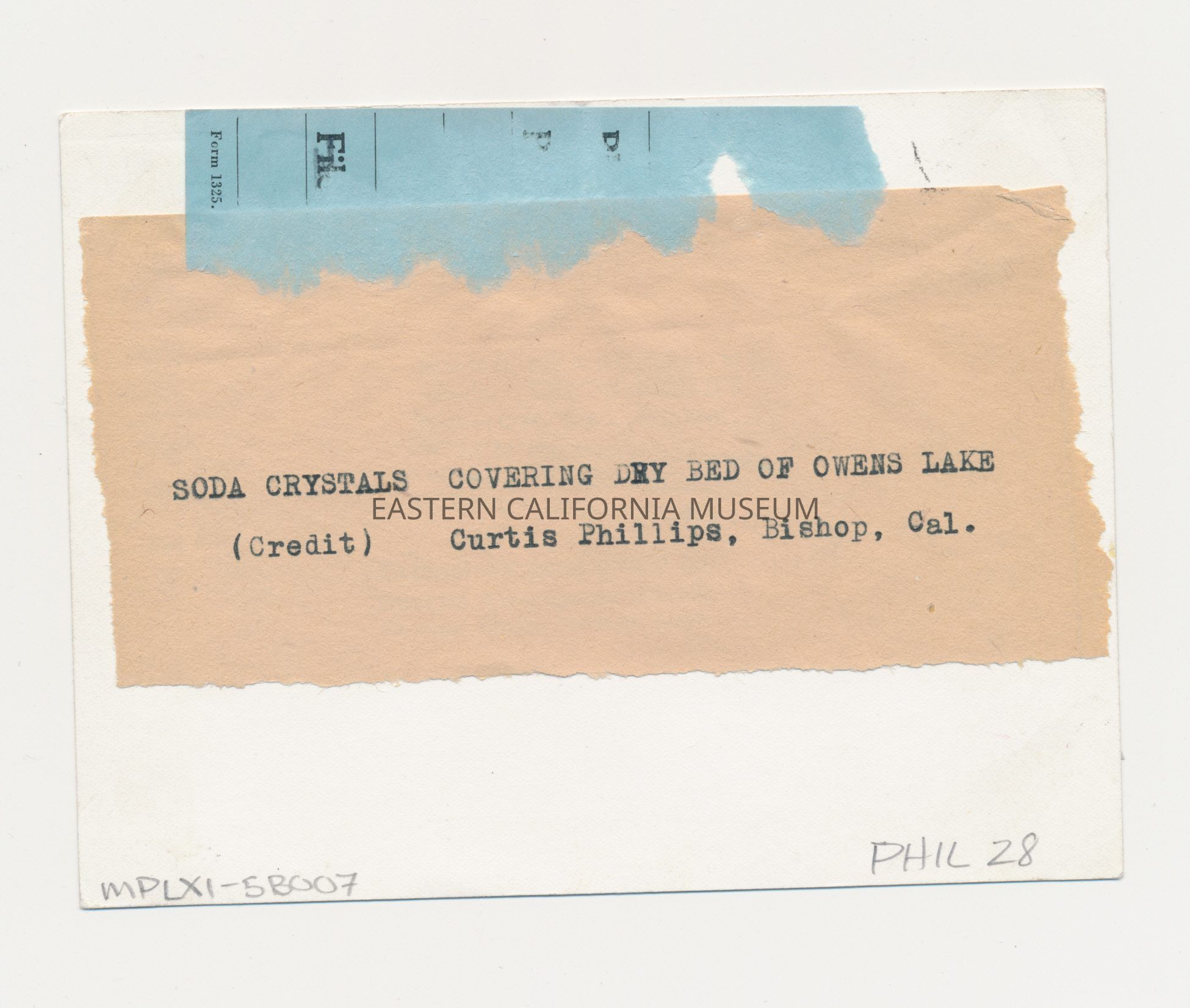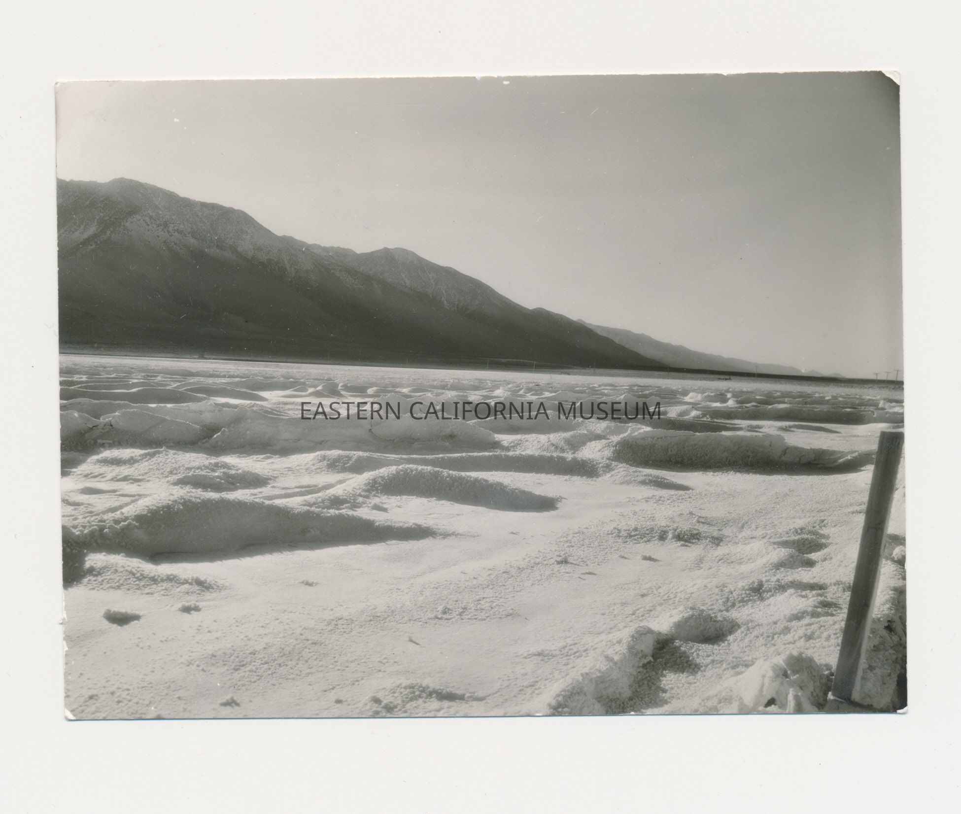 Paper label affixed to reverse: Soda crystals covering dry bed of Owens Lake. (Credit) Curtis Phillips, Bishop, Cal.