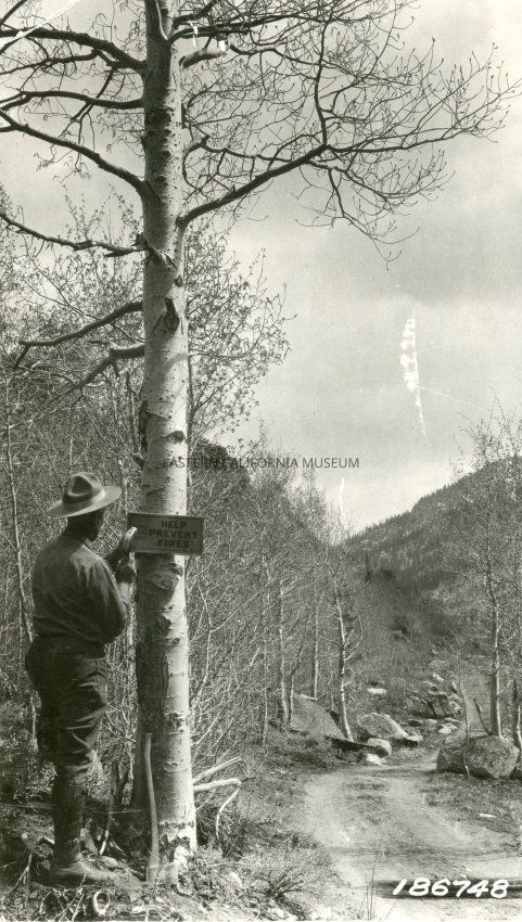 B&W glossy print: forest ranger hanginga "Help Prevent Fires" sign