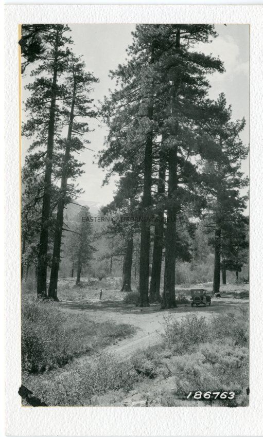 B&W matte print: mounted on heavy card stock; early model car and one man, tall pine trees