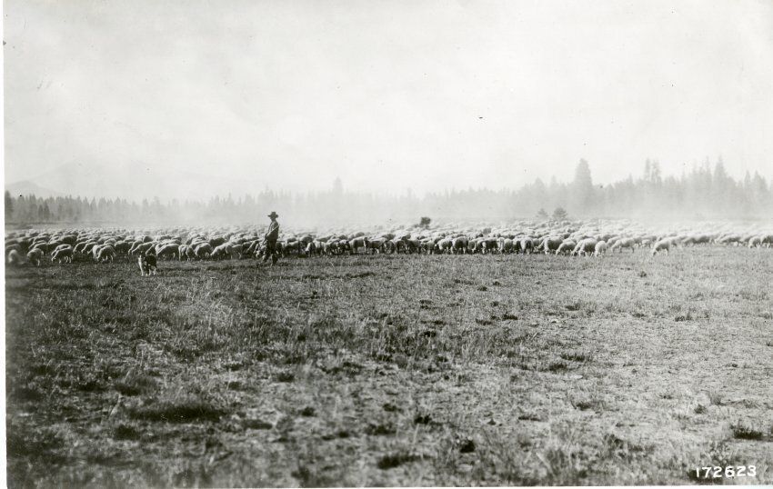 B&W glossy print: large flock of sheep with lone sheepherder