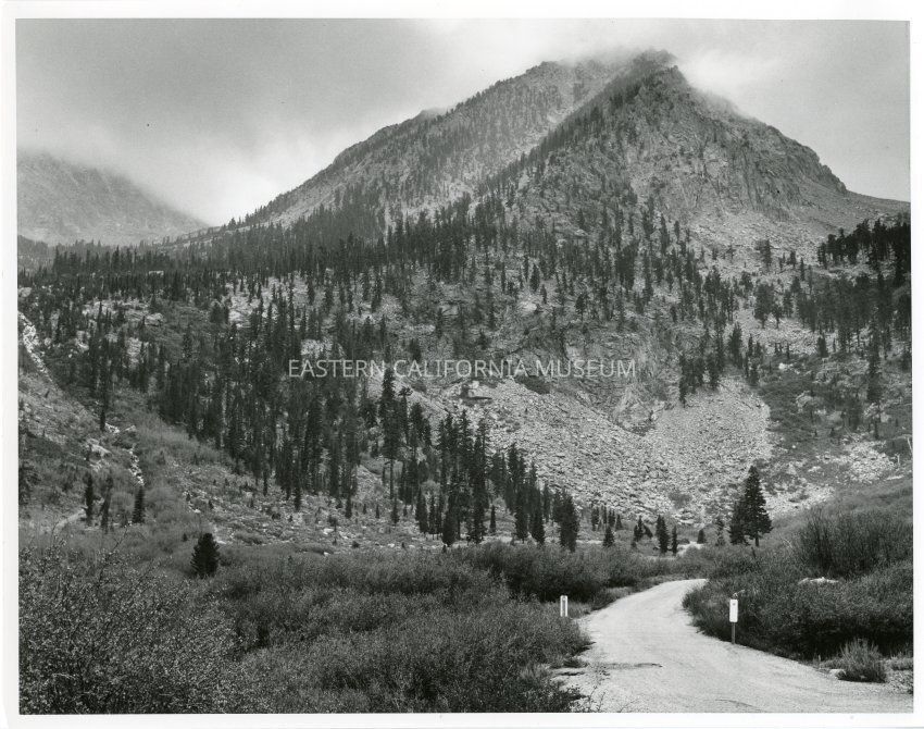 B&W glossy print: landscape with dirt road and tree covered mountain