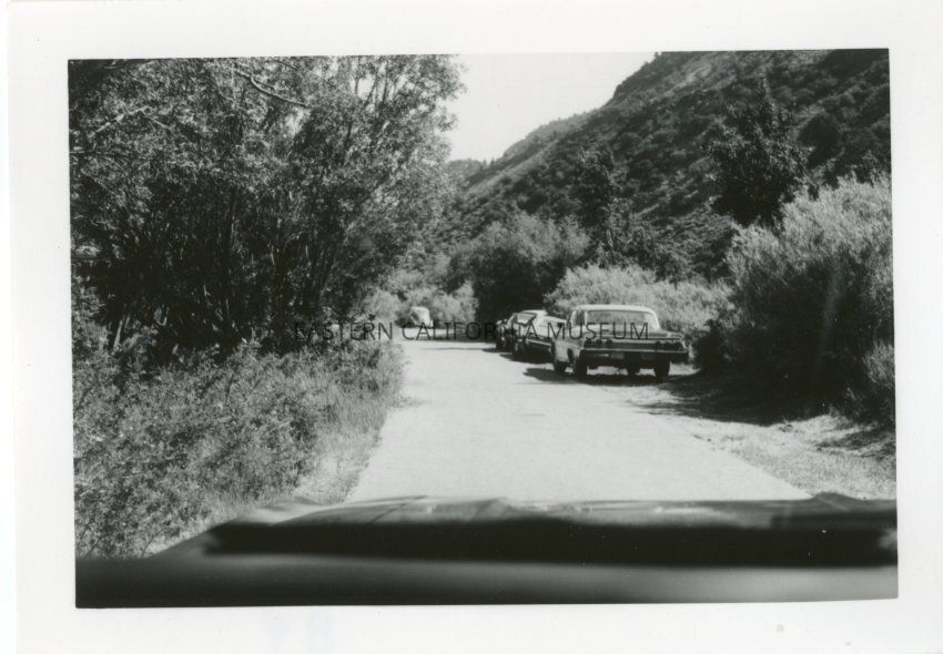 B&W glossy print: paved road, cars, perhaps in a campside or trailhead site; in with other photos from the June Lake area