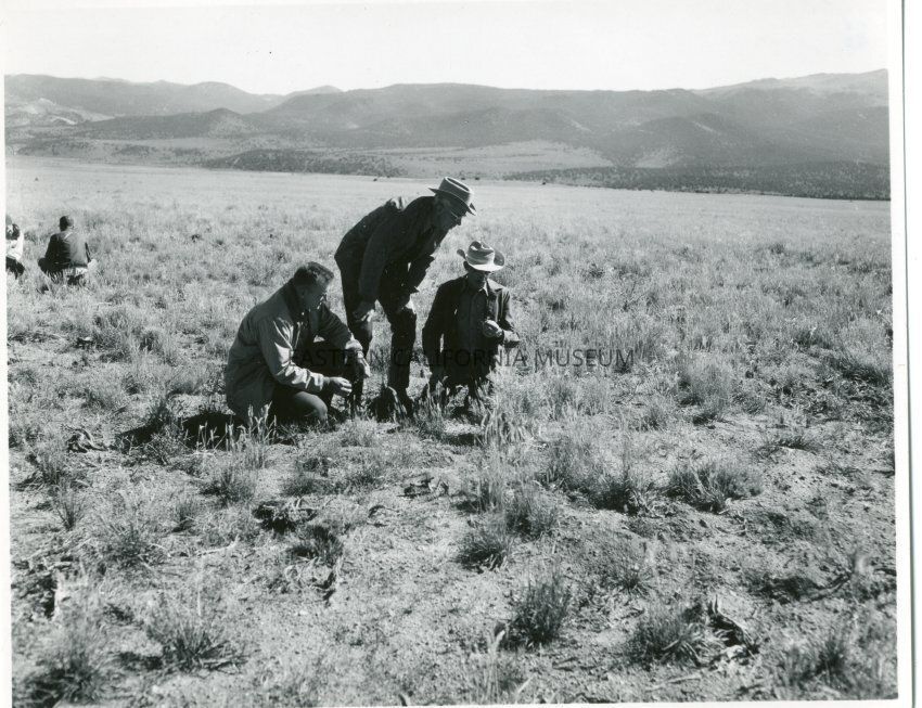 B&W glossy print: 3 men at reseeding project in Sweetwater Mountains area (Bridgeport)