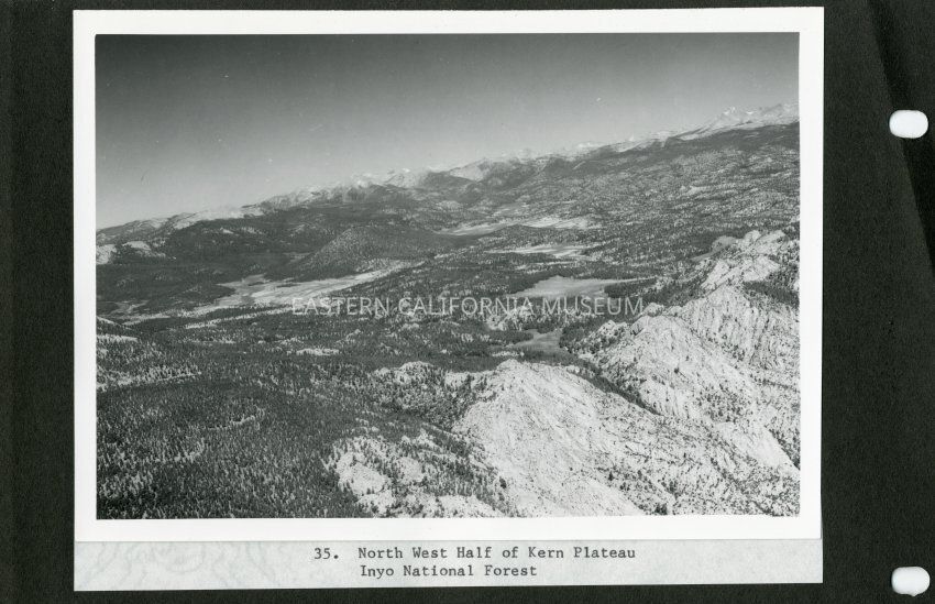 B&W glossy print: mounted on black paper, from an album: aerial photo of the Kern Plateau