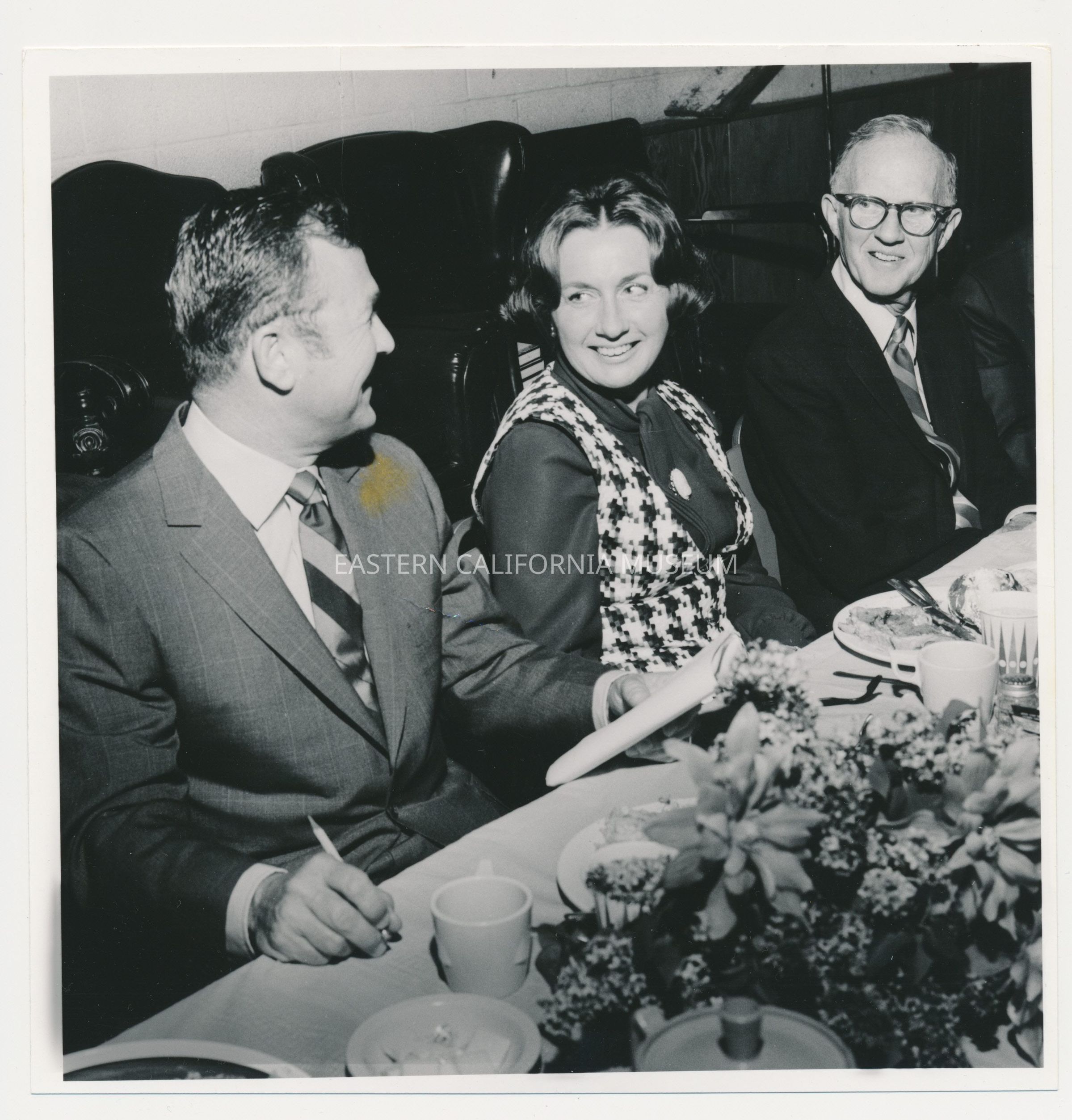 Photo of (LtoR) Remi Nadeau, his wife Margret Nadeau, and Henry Raub at a dinner. Stamped in purple ink on reverse with Curtis Phillip's stamp and the date April 18, 1970.