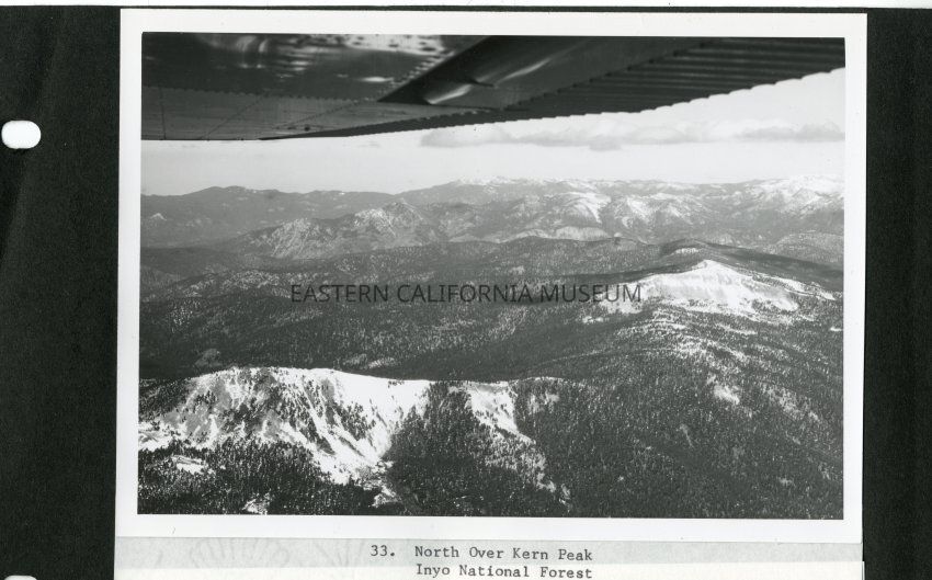 B&W glossy print: mounted on black paper from an album; aaerial photo of Kern Peak