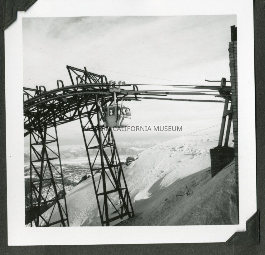 B&W glossy print: mounted on black paper from an album; gondola at the top of Mammoth Mountain Ski Area