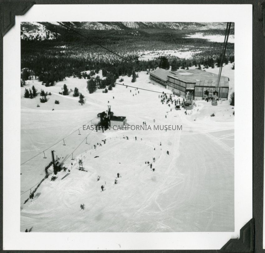 B&W glossy print: mounted on black paper from an album; looking down on the main lodge at Mammoth Mountain Ski Area