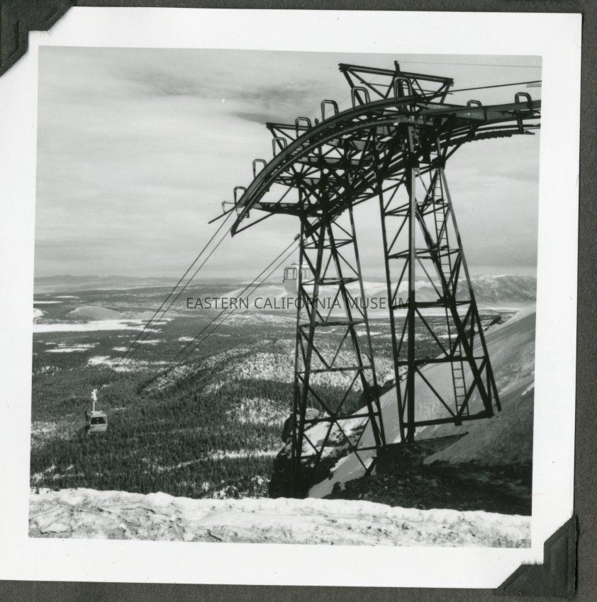 B&W glossy print: mounted on black paper from an album; upper gondola and tower at Mammoth Mountain