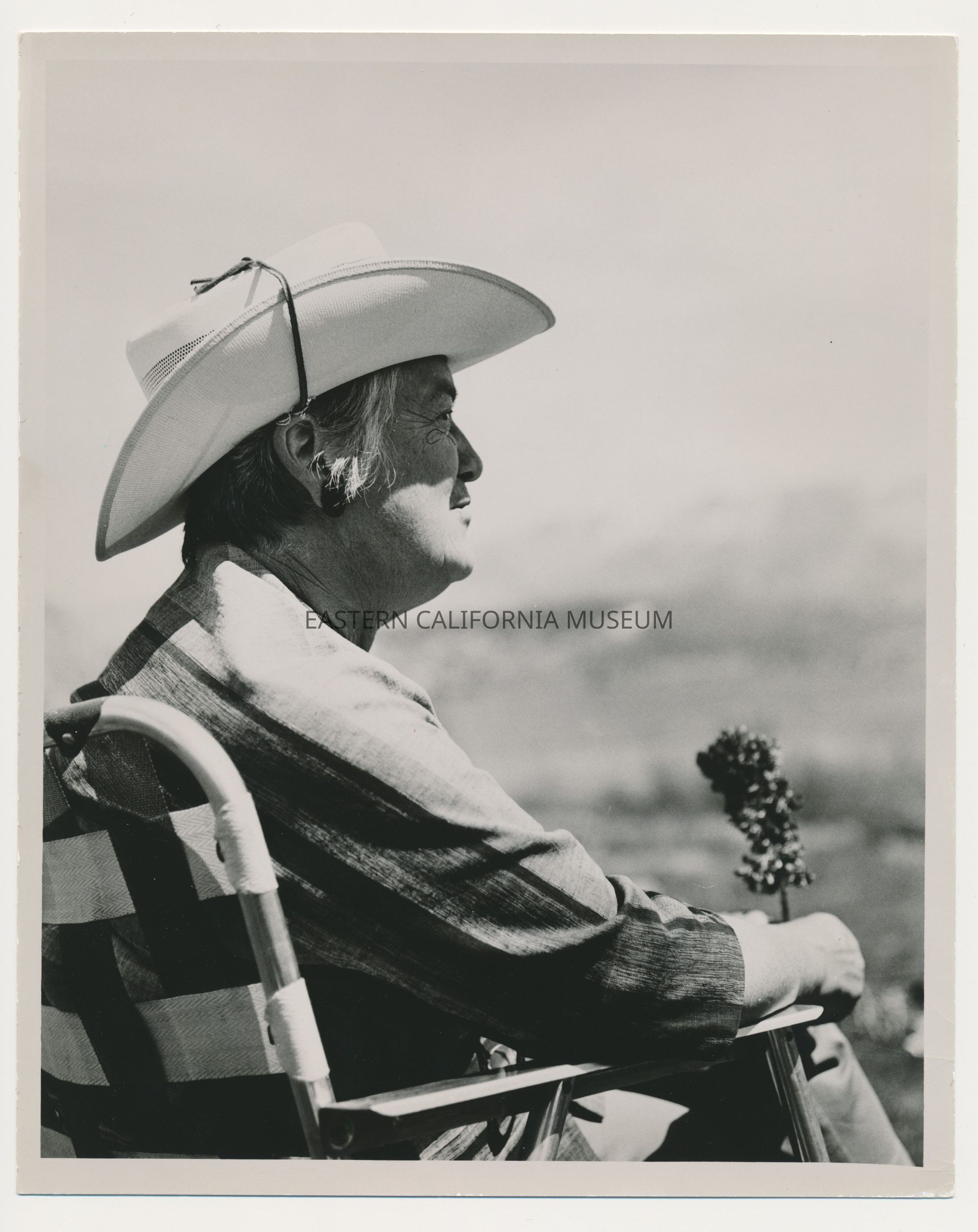 Photo of author Evelyn Eaton sitting in a folding chair. She is posed with her face in profile.