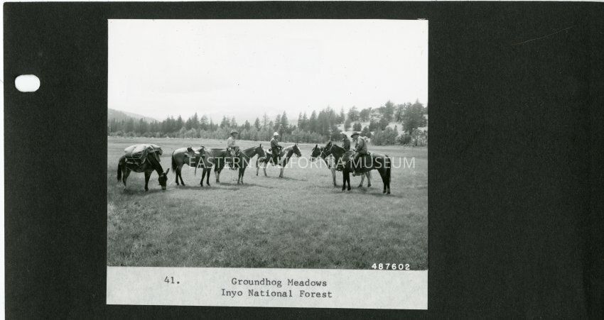 B&W glossy print: mounted on black paper from an album; several men on horseback in Groundhog Meadow