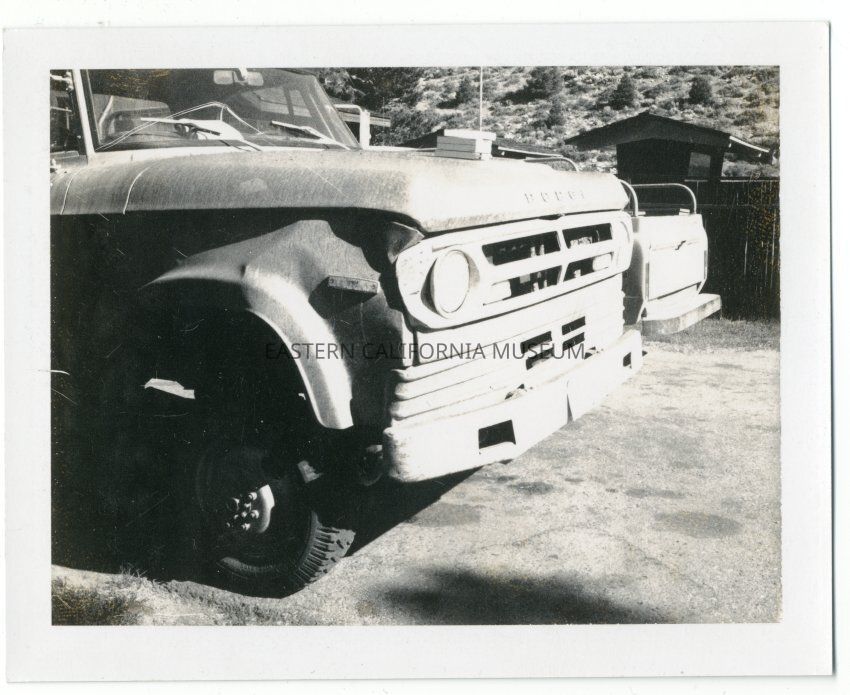 B & W print: Front end of a truck, perhaps parked at a Forest Service ranger station