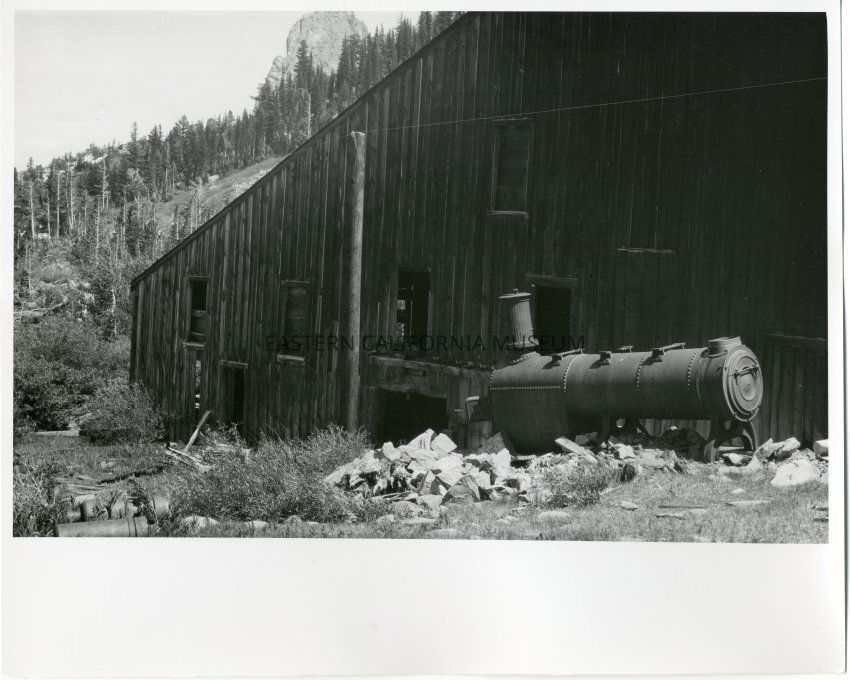 B&W glossy print: mining structure, engine, Mammoth Rock in background