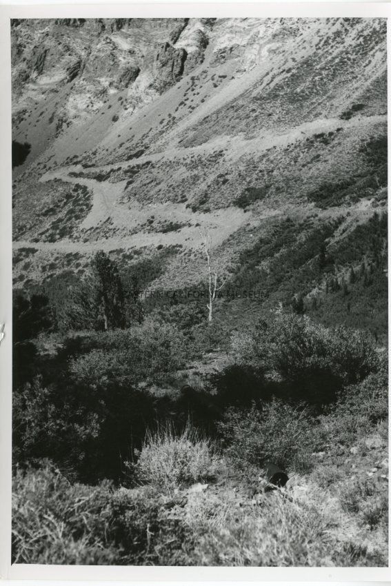 B&W glossy print: dirt road winding up a mountainside