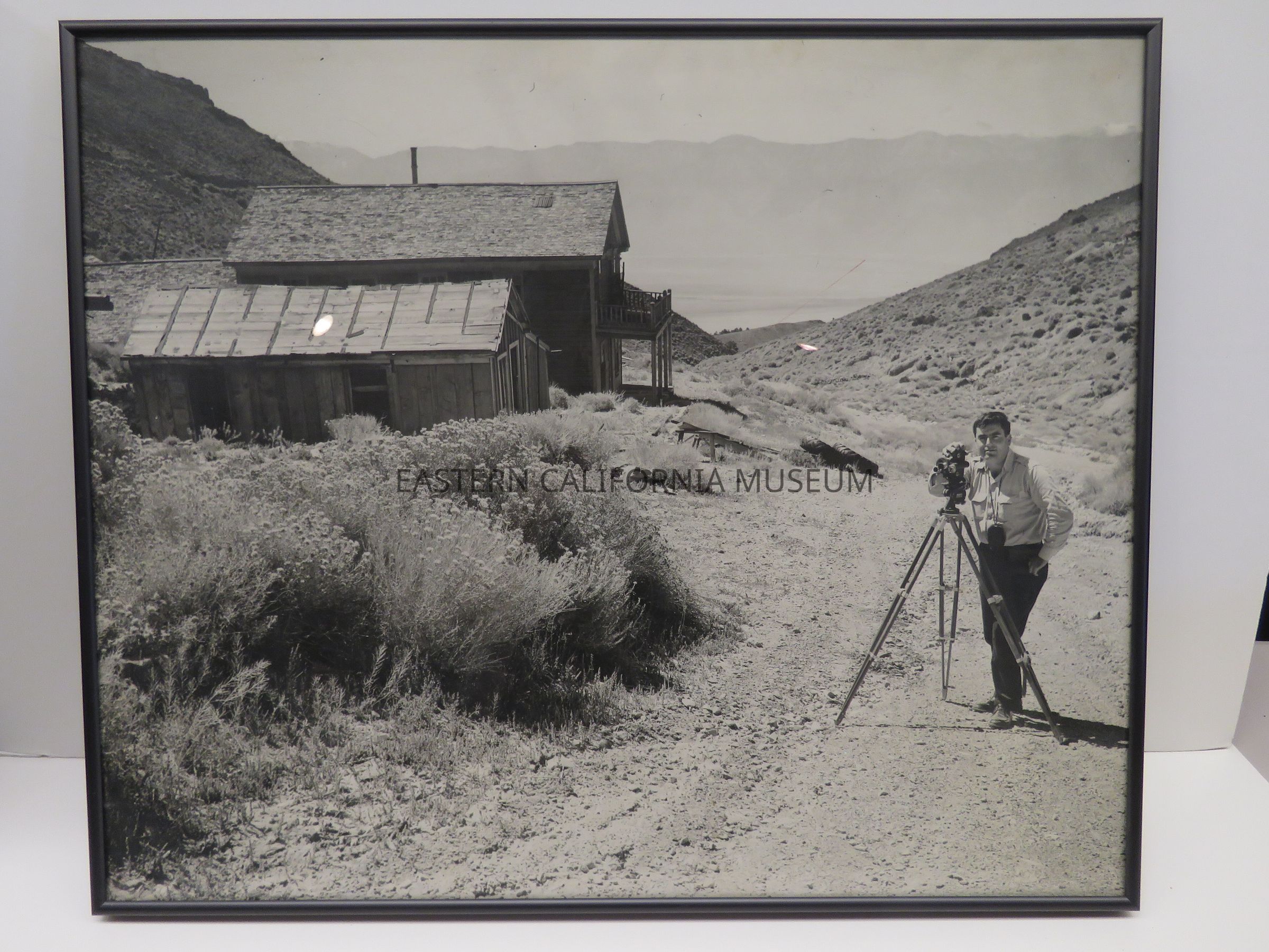 Framed enlarged black and white photograph of writer Buddy Noonan with his camera at Cerro Gordo, about 1950. Noonan is standing next to his tripod and camera on a dirt road with buildings (including the American Hotel) in upper left of picture.Collection