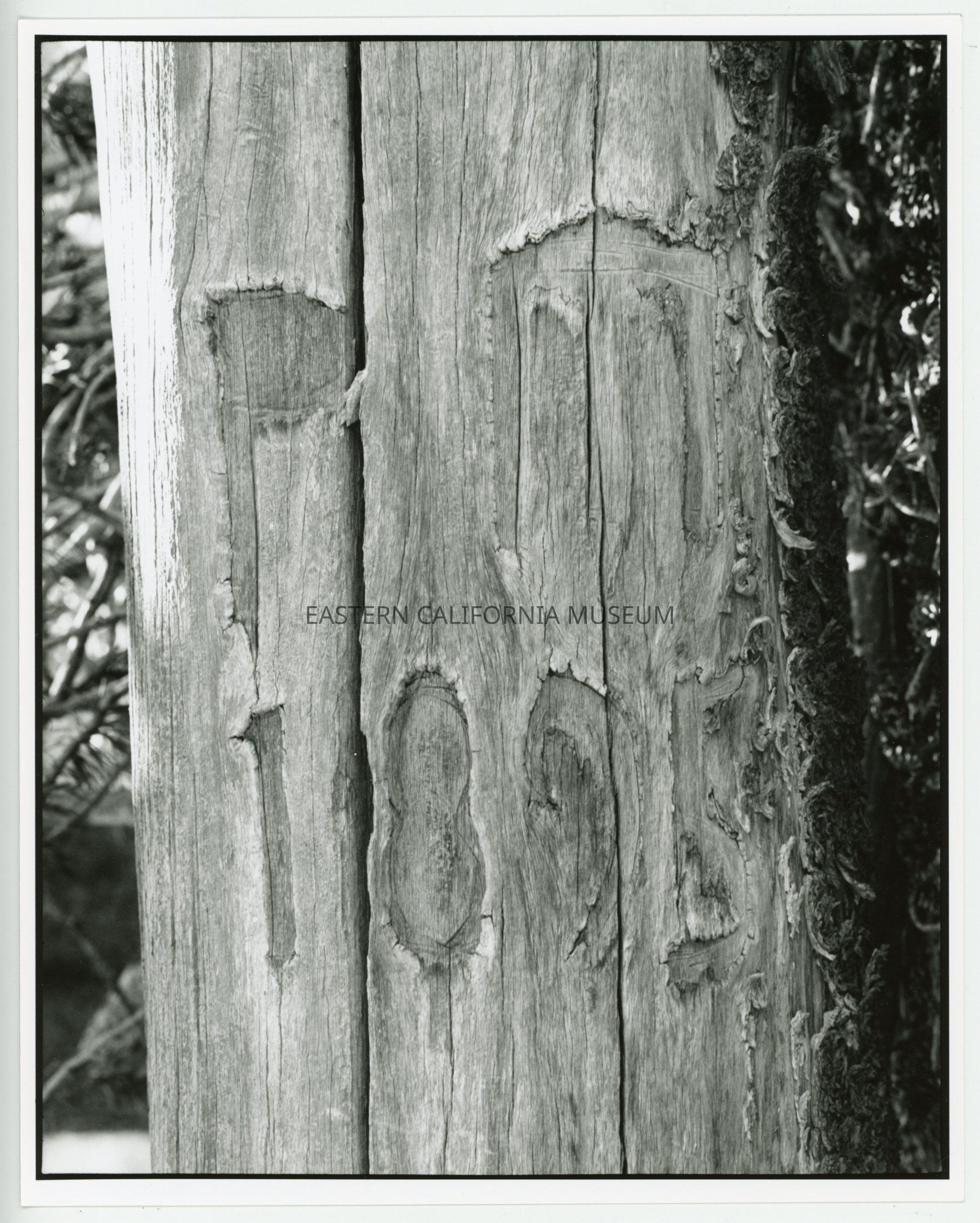 Photo of an arborglyph of what might be the initials "PM" and the date 1895.Collection