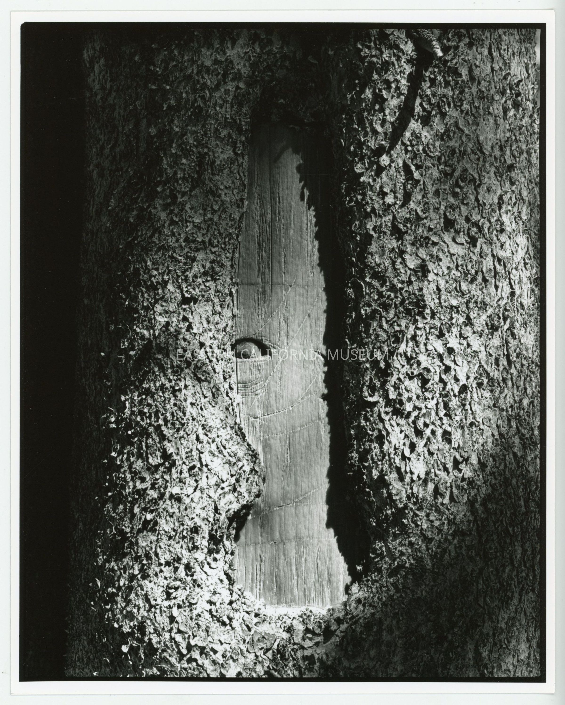 Photo of an arborglyph of what might be a face in profile with deeply carved eye.Collection