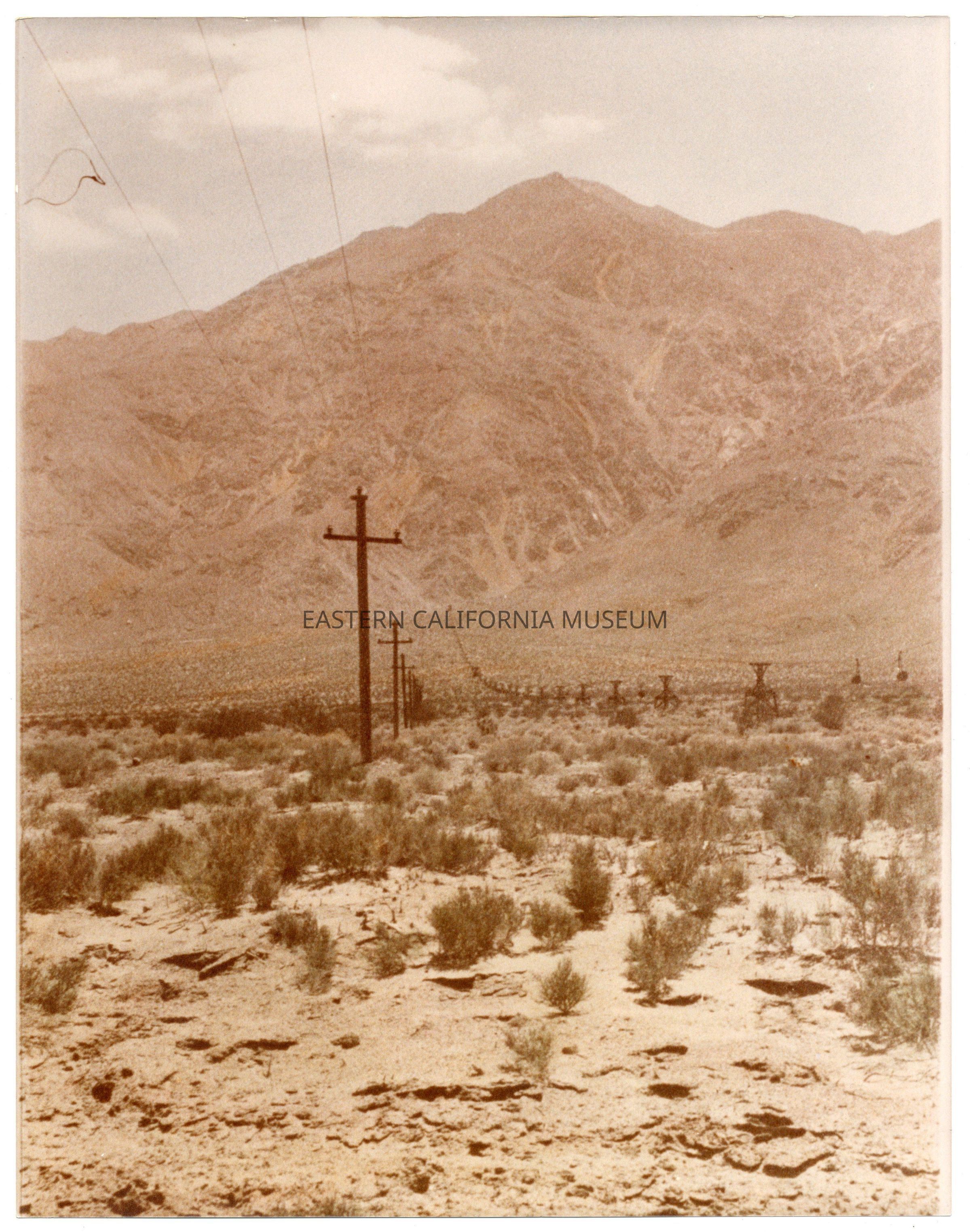 Enlarged color photo of an aerial tram, possibly the Keeler-Cerro Gordo tramway. There are three ore buckets visible hanging from the cable. Photo was likely taken by the donor's husband, Bill Walker.Collection