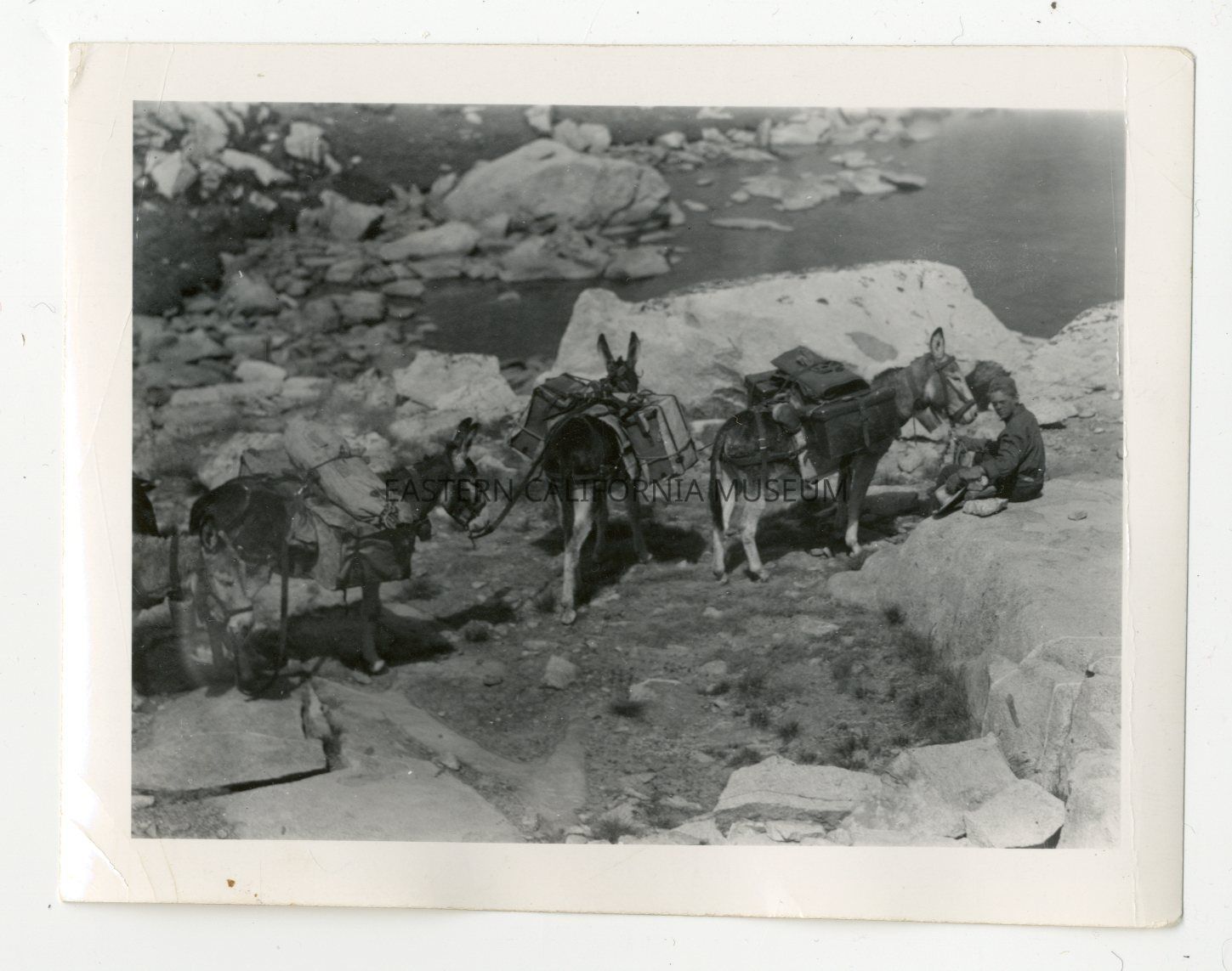 Photo of several pack mules or burros and a young man leading them. There is a lake shoreline in the background.