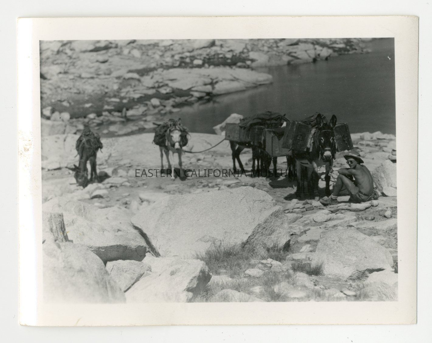 Photo of a string of pack mules or burros and a shirtless young man sitting near them. There is a lake in the background.