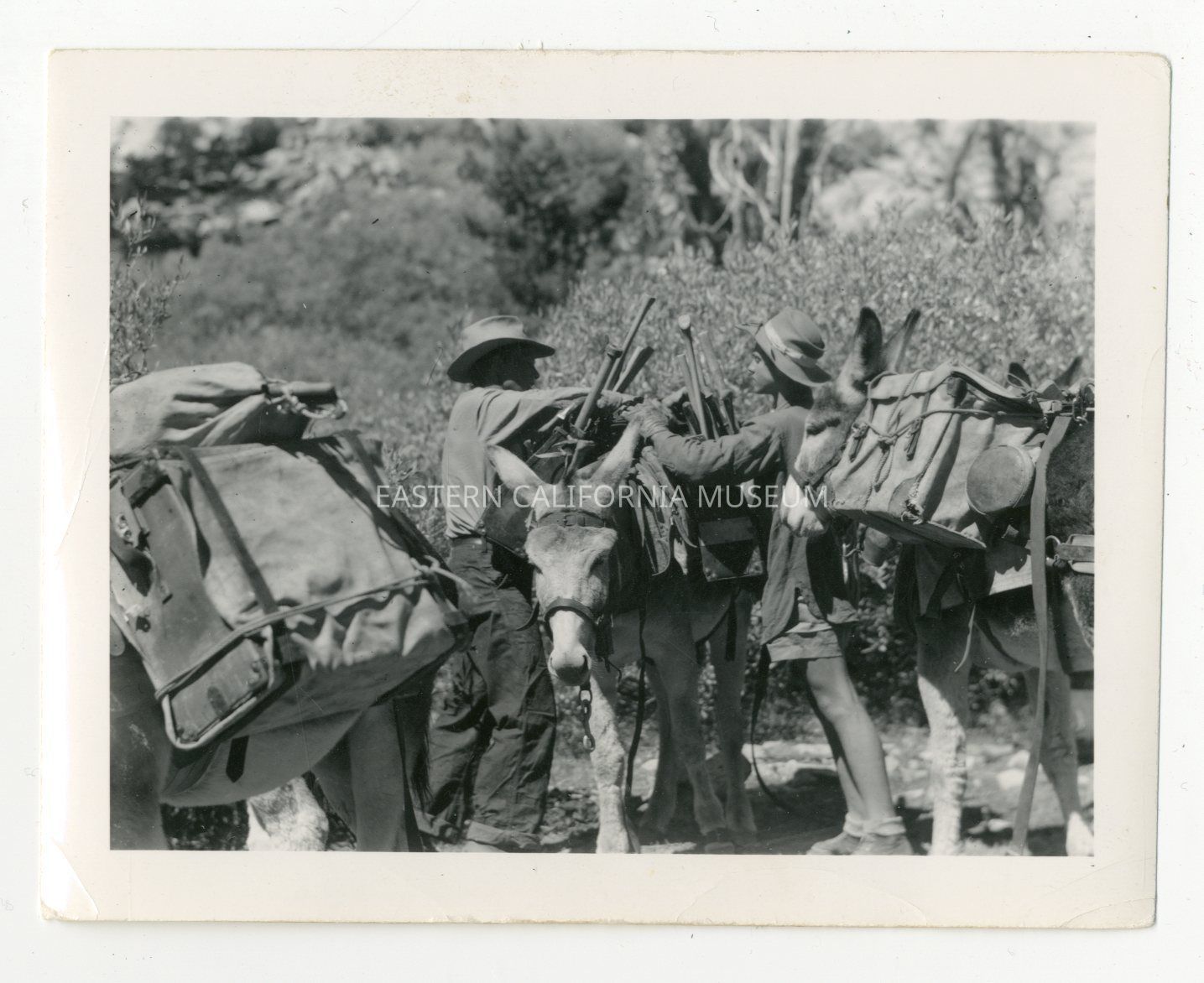 Photo of a man and a young boy loading up a pack mule or burro. There appear to be several mining drills in the pack.