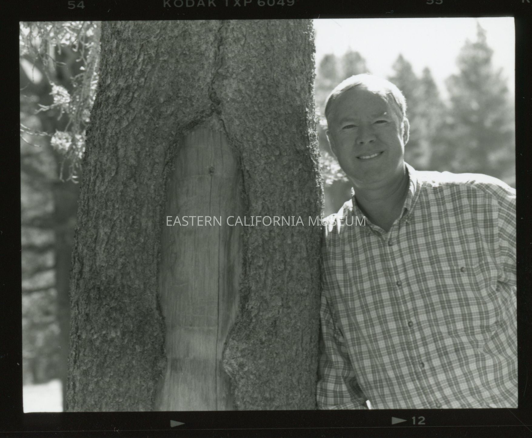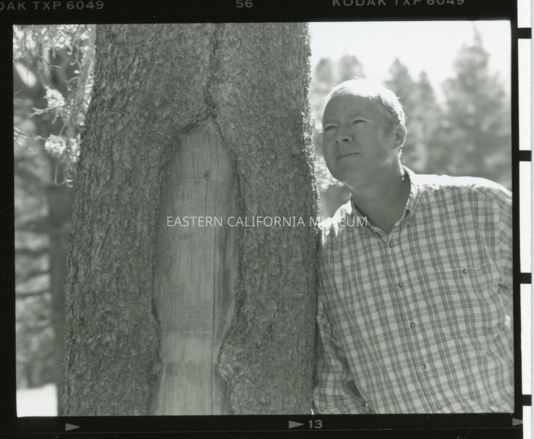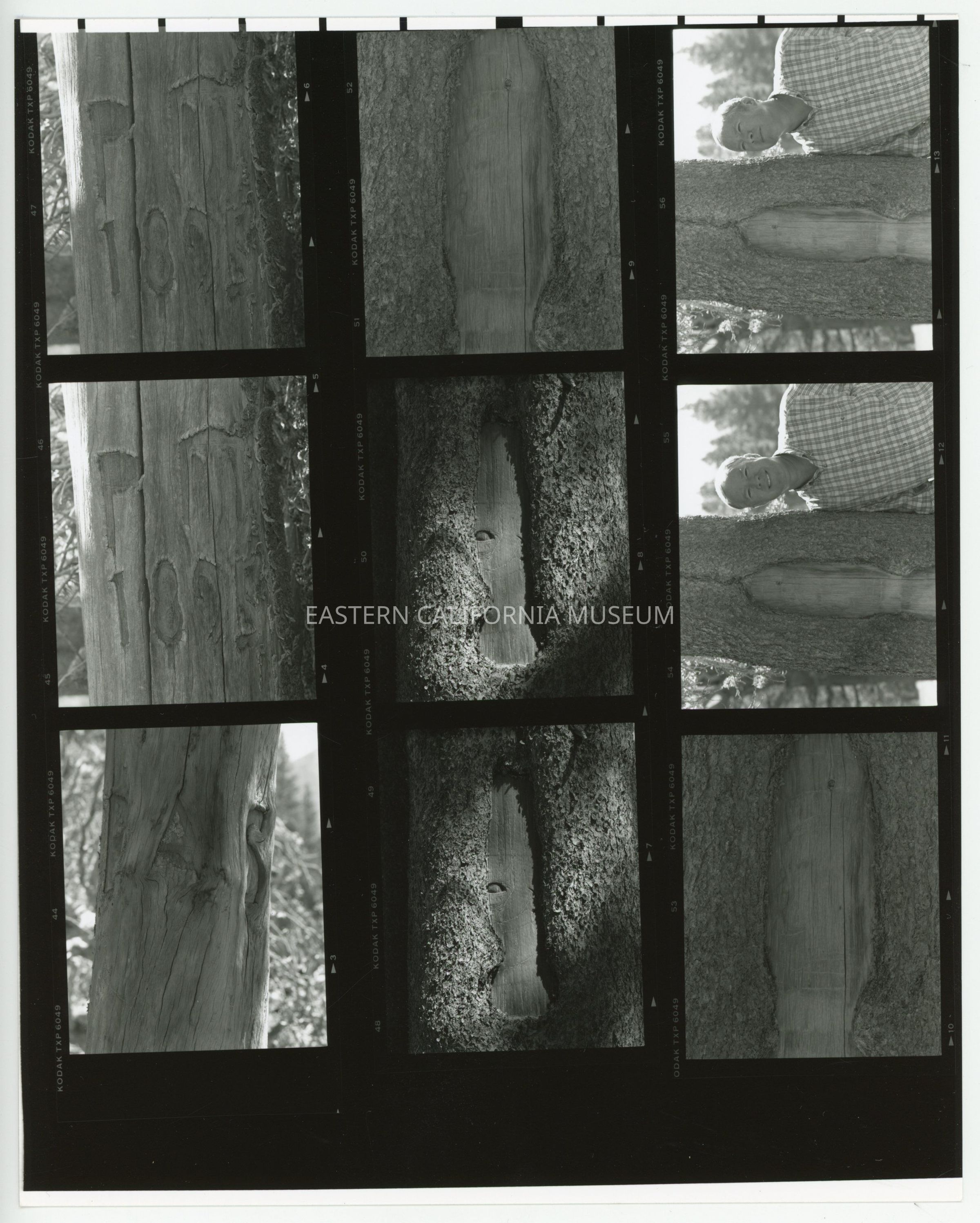 Contact sheet containing nine photos. Seven of the nine photos are 2021.33.1-4, and the remaining two are two shots of a man (Dave McNeil?) leaning against a tree with an arborglyph carved in it.