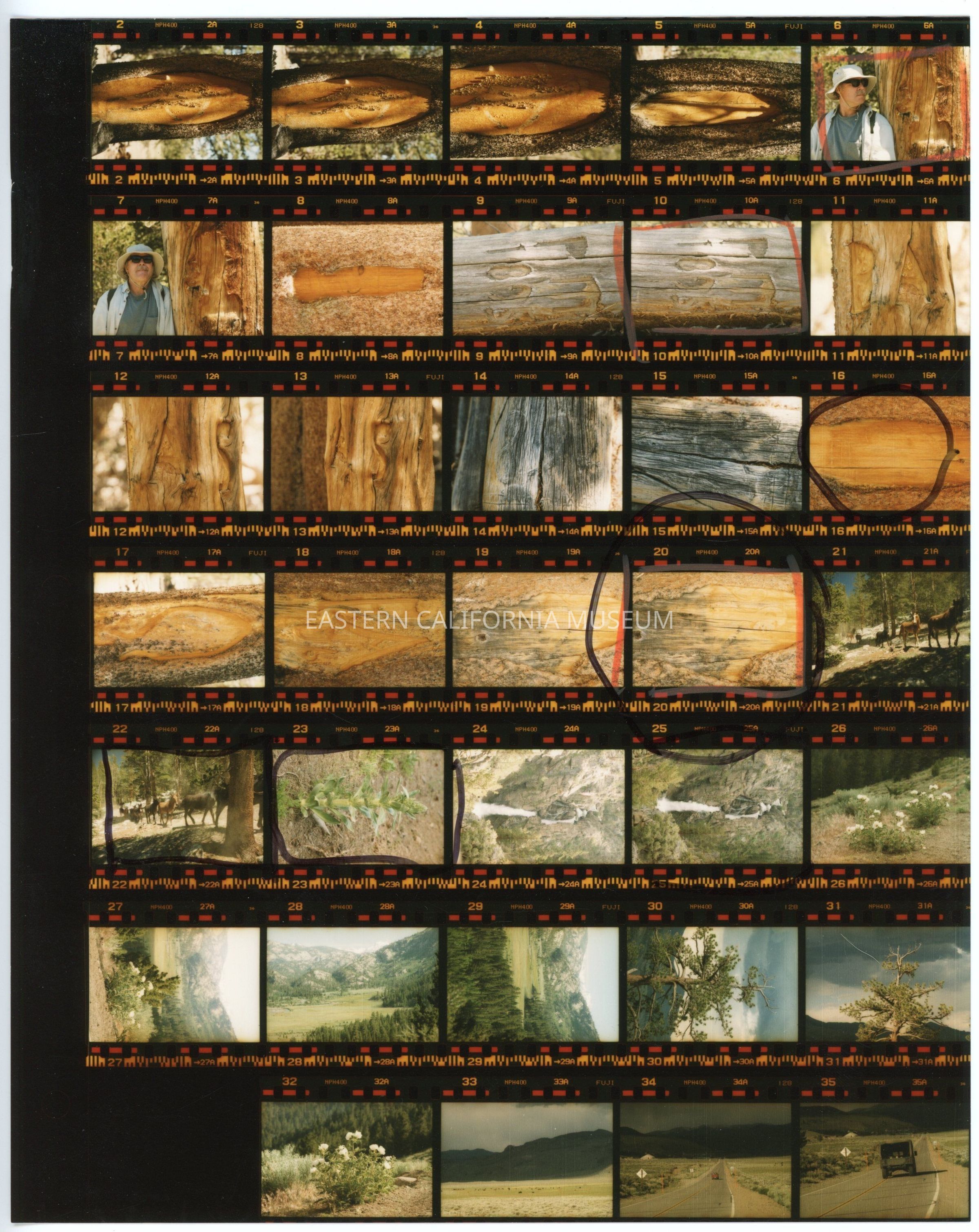Contact sheet containing 34 color photos of arborglyphs, an unidentified man (Dave McNeil?), horses or mules, plants and trees, a waterfall, mountain landscapes, and cars on a road. Six of them have been circled.