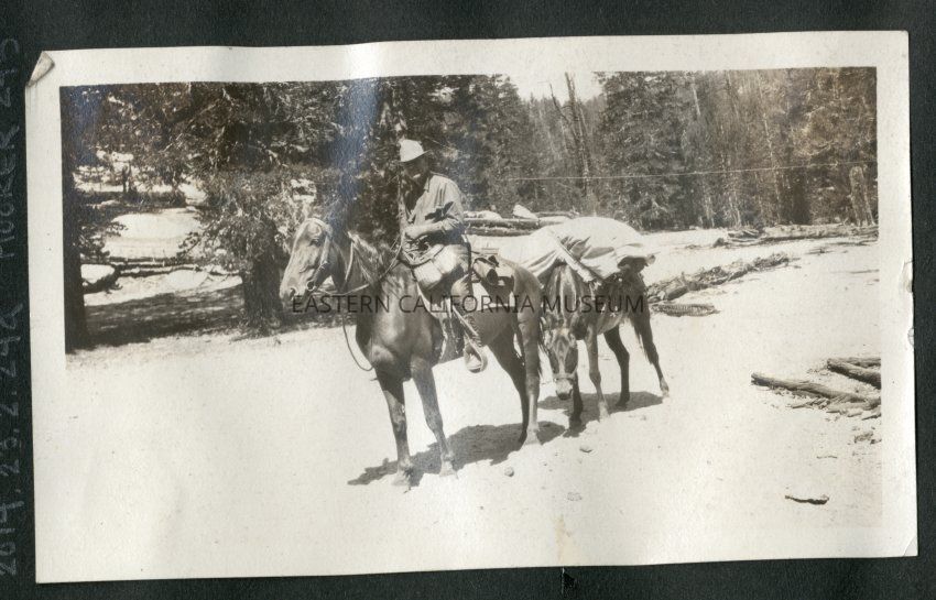 Man mounted on horse with a pack animal. He has a fisherman's creel attached to the pommel of the saddle.