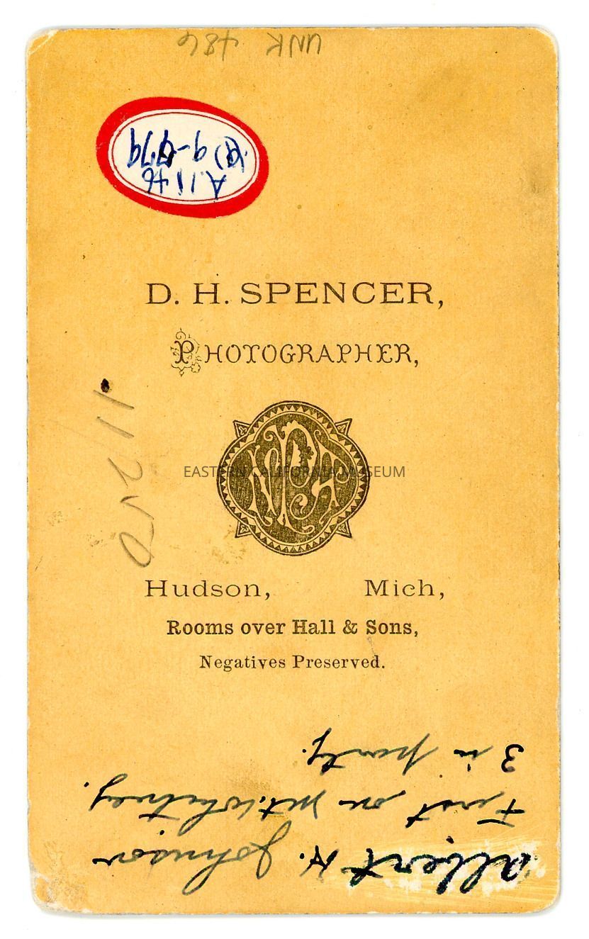 Small mounted studio portrait of Albert H. Johnson. Photographer was D. H. Spencer of Hudson, MI.