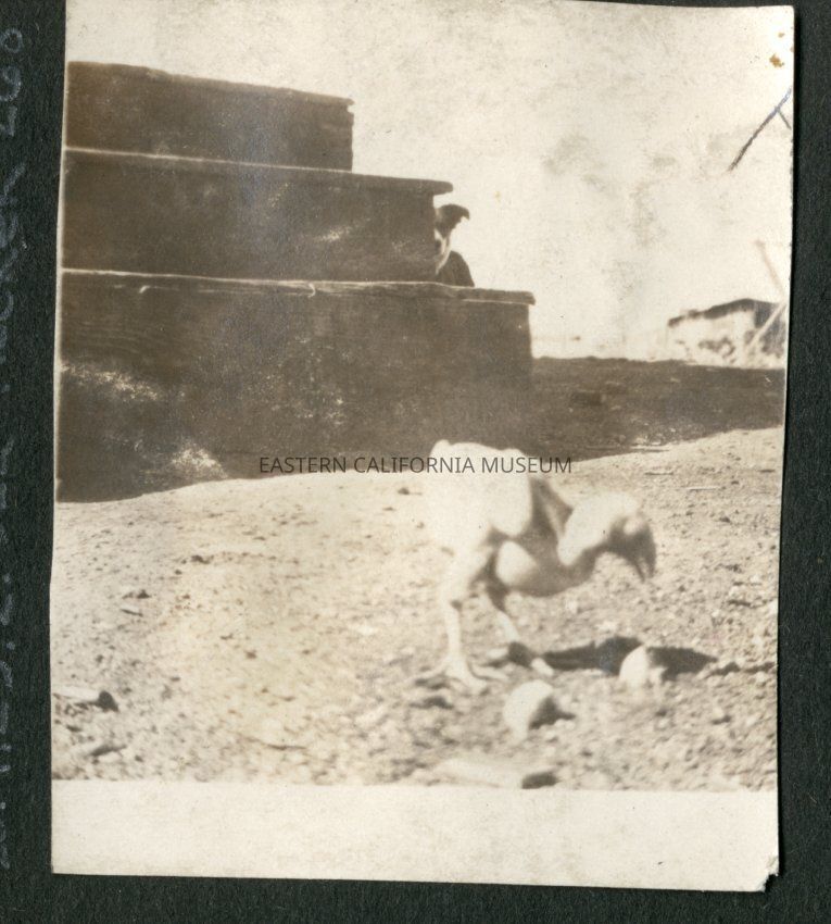 Photo of a featherless chick in the foreground with a dog watching from behind a set of steps.