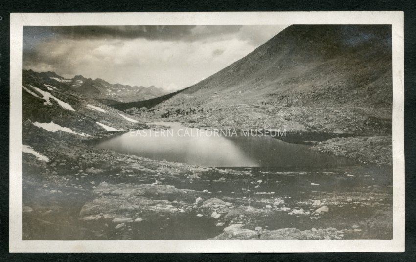Landscape photo of a mountain lake surrounded by boulders and snow patches.