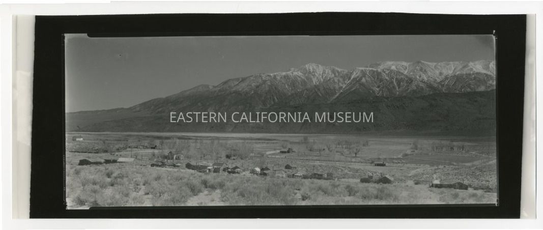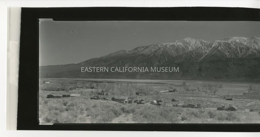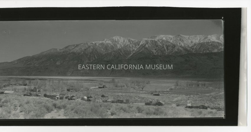 Copy of a panorama photo of a small town with the Sierra Nevada in the background. Written in pencil on reverse is, "Old Benton, school on left."