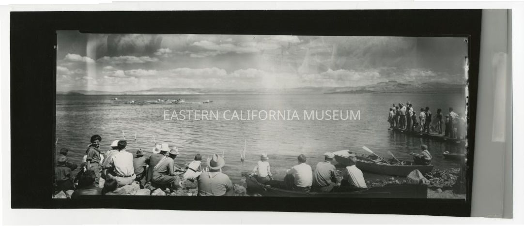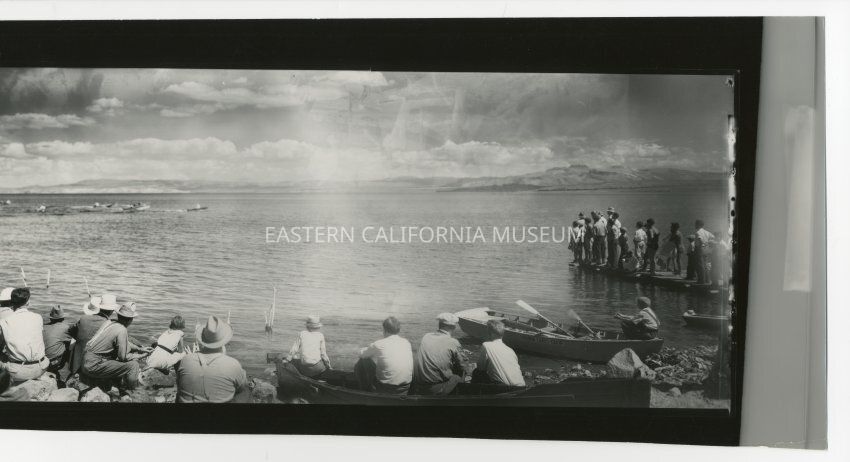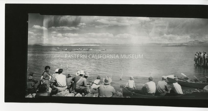Copy of a panorama photo of people standing and sitting along the edge of Mono Lake watching boat races. A boat in the foreground says, "Virginia Lakes Camp." Written in pencil on reverse is, "Boat races, Mono Lake, Mark Twain Days, c. 1930s."