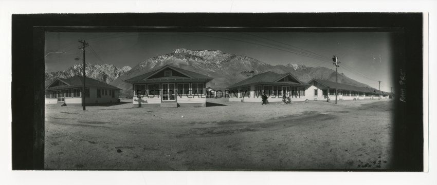 Copy of a panorama photo of a row of houses/buildings with Sierra Nevada in background. There are electrical poles in front of the houses, and a group of children with a woman standing in front of one of them. It looks like some sort of company housing? Possibly Cartago? Maybe a Ramsey photo?