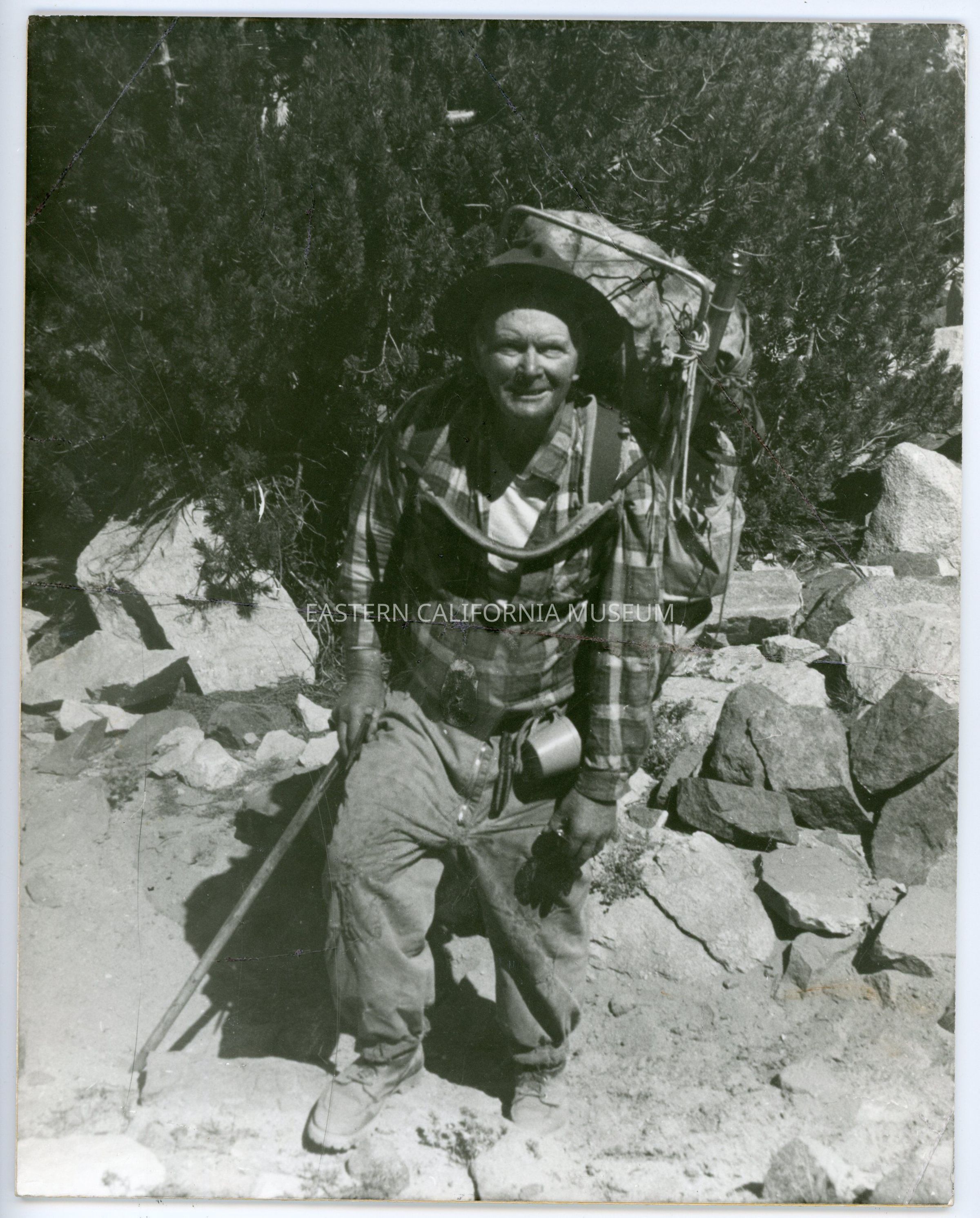 Mounted photo of Norman Clyde on in his later years, hiking with a giant backpack and ice axe.