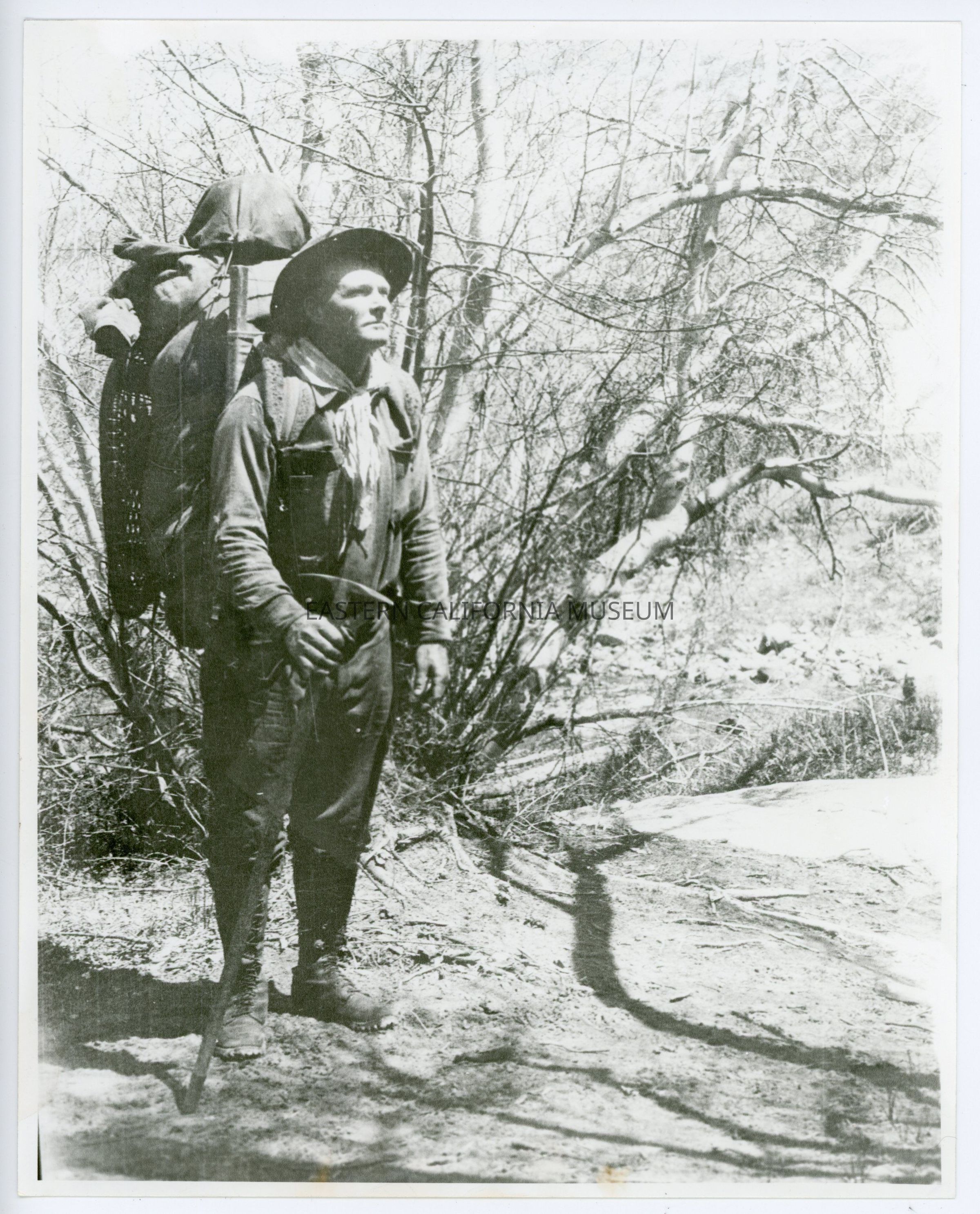 Photo of Norman Clyde standing with his pack on and ice axe in hand. Written on reverse: The pack that walked like a man!