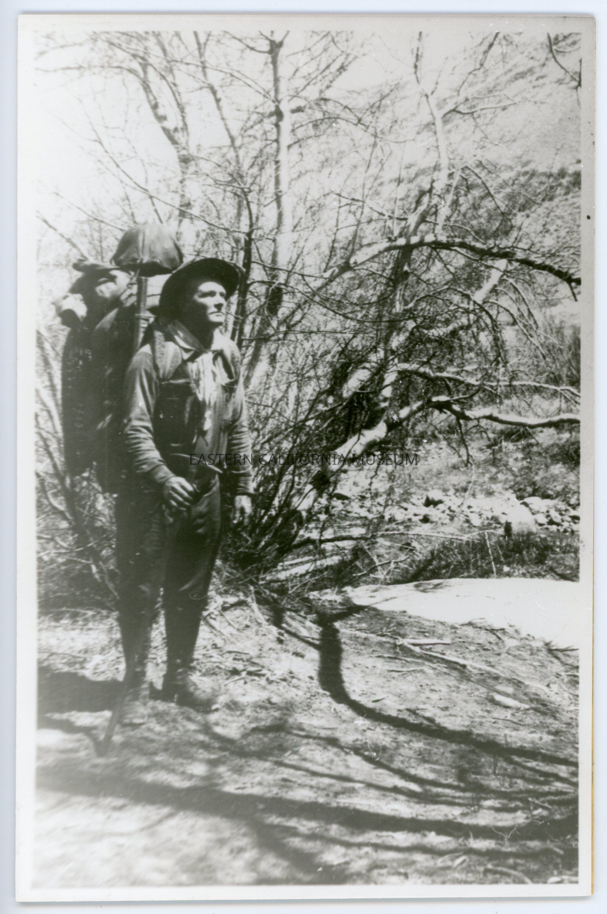 Mounted photo of Norman Clyde standing with his pack on and ice axe in hand.