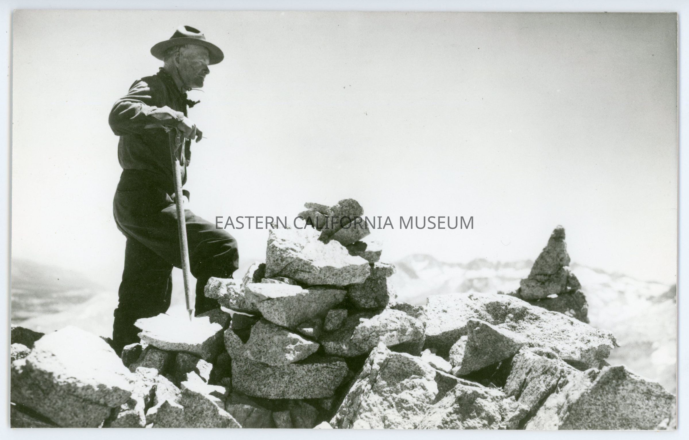Mounted photo of Norman Clyde standing next to a stone cairn. His right arm is resting on what looks like a walking stick or ice axe.