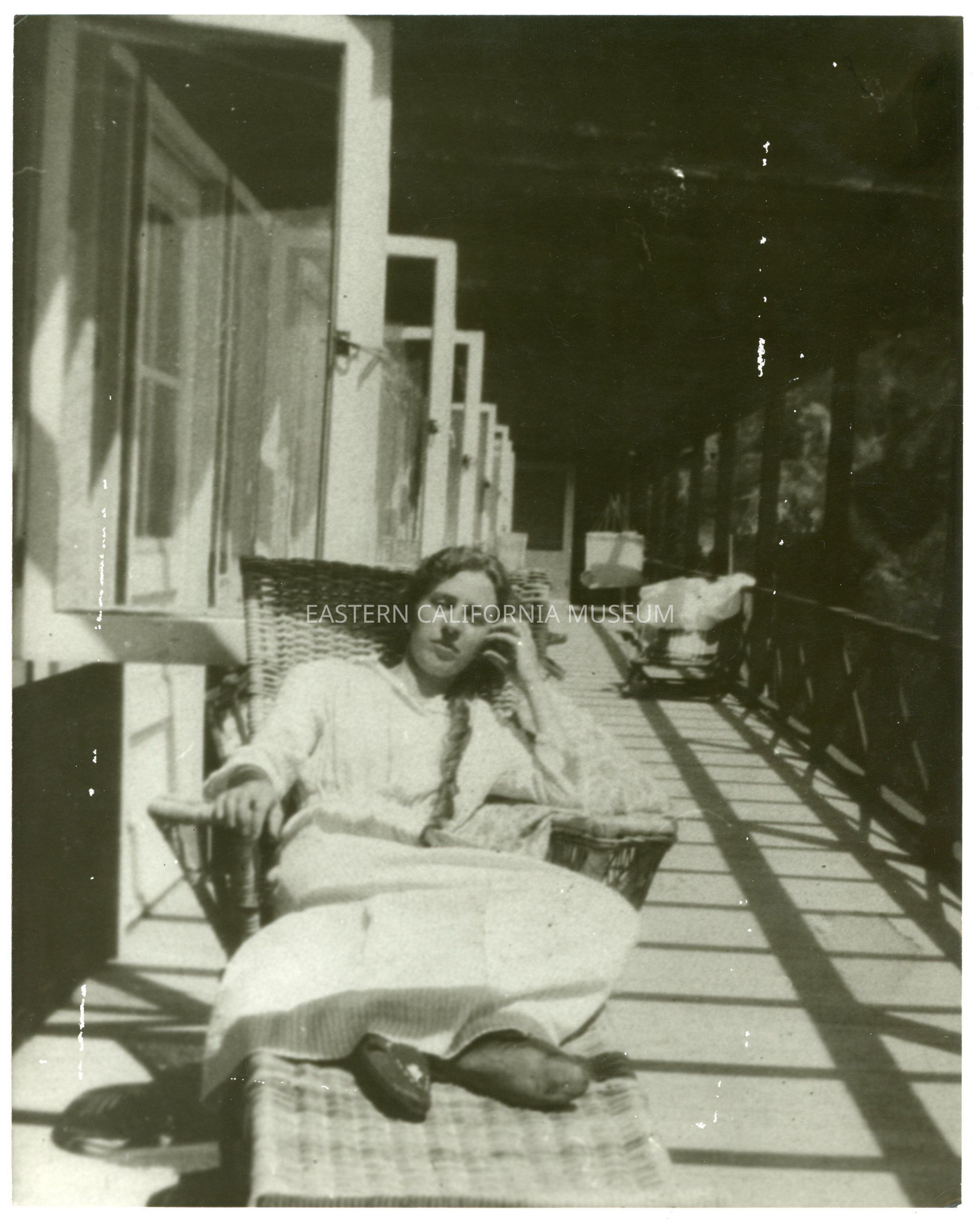 Photo of Winifred May Bolster Clyde, the wife of Norman Clyde, laying on a lounge chair in the outdoor patio at a sanitorium where she was being treated. She passed away on 02/14/1919.Collection