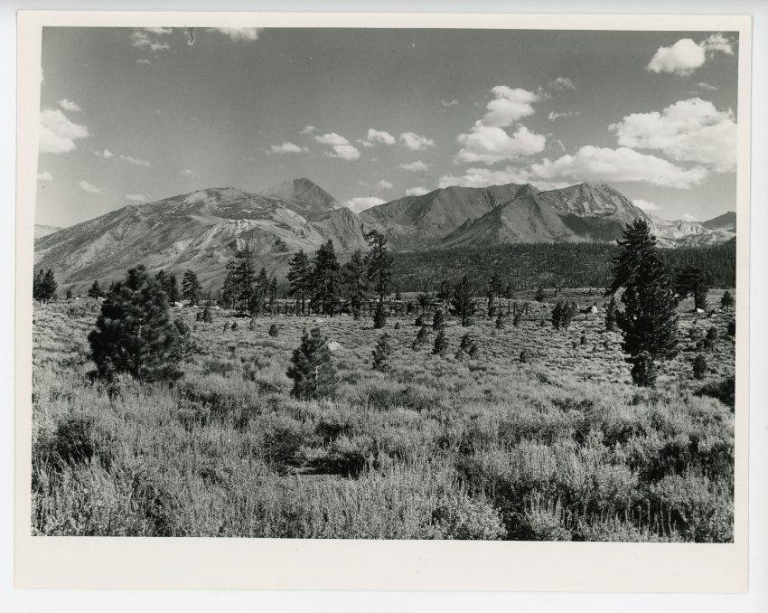 Photo of mountain landscape, with pine trees dotting the foreground. Label on reverse: Area of concern over possible volcanic eruption, Highway 395 near Mammoth Lakes.